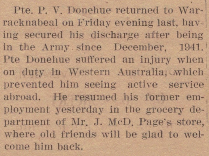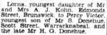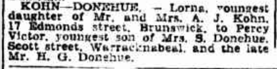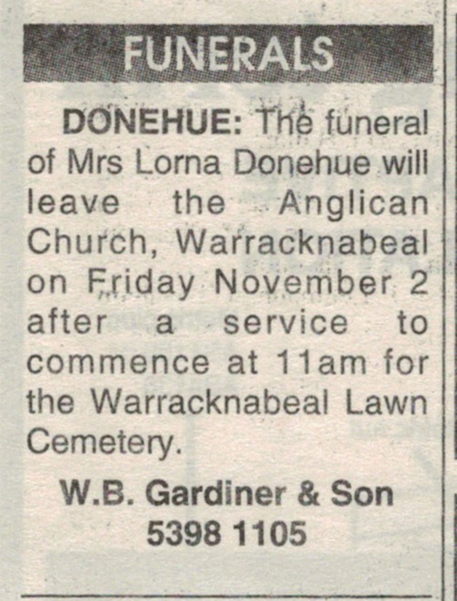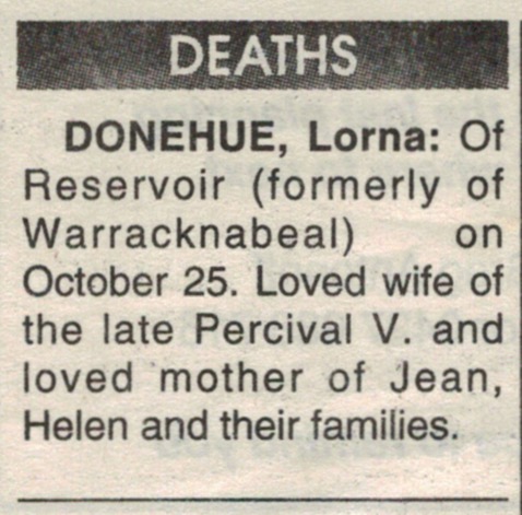 Published References (1.7.4 DONEHUE) “Warracknabeal Herald” (Vic.), Tuesday 30 October 1945, page 2. “Argus” (Melbourne, Vic.), Saturday 26 January 1946, page 12 (extract from article “Engagements Announced”) [Trove]. “Herald” (Melbourne, Vic.), Thursday 31 January 1946, page 13 (extract from article “Engagements”) [Trove]. “Warracknabeal Herald (Vic.), Friday 27 May 1988, page 4. “Warracknabeal Herald” (Vic.), Tuesday 30 October 2007, page 8. “Warracknabeal Herald” (Vic.), Tuesday 30 October 2007, page 8.