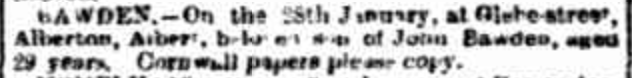 Published References (1.1.11 BAWDEN) “Advertiser” (Adelaide, SA), Tuesday 6 February 1894, page 3 (“Deaths”) [Trove].