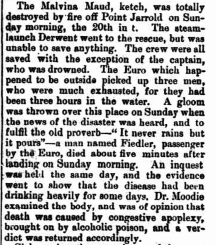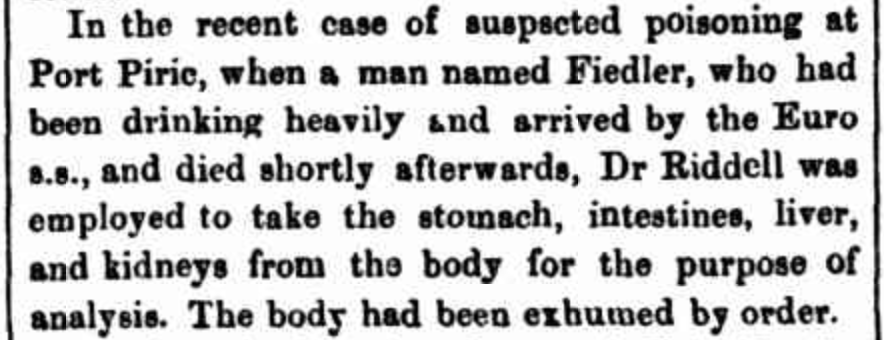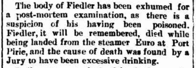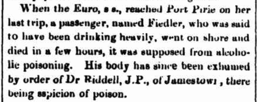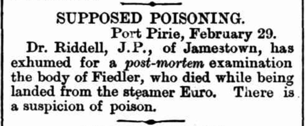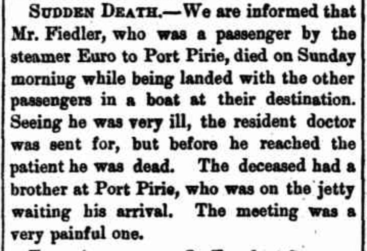 “Northern Argus” (Clare, SA), Friday 25 February 1876, page 2 [Trove].“Northern Argus” (Clare, SA), Tuesday 29 February 1876, page 2 (extract from article “Port Pirie”) [Trove].“Express and Telegraph” (Adelaide, SA), Thursday 2 March 1876, page 2 (extract from article “General News” ). Also published in “South Australian Chronicle and Weekly Mail” (Adelaide, SA), Saturday 4 March 1876, page 7 (extract from article “News of the Week”) [Trove].“Adelaide Observer” (SA), Saturday 4 March 1876, page 3. Also published in “South Australian Register” (Adelaide, SA), Wednesday 1 March 1876, page 5; and “Evening Journal” (Adelaide, SA), same date, page 2 [Trove].“Wallaroo Times and Mining Journal” (Port Wallaroo, SA), Saturday 4 March 1876, page 2 [Trove].“Wallaroo Times and Mining Journal” (Port Wallaroo, SA), Saturday 11 March 1876, page 2 [Trove].“Yorke’s Peninsula Advertiser and Miners’ and Farmers’ Journal (Moonta, SA), Tuesday 14 March 1876, page 3 (extract from article “General News”) [Trove].