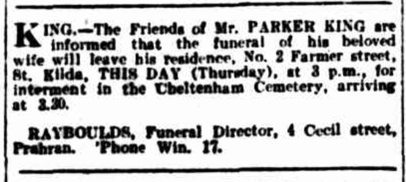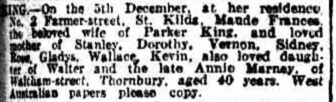 Published References (1.1 MARNEY) “Age” (Melbourne, Vic.), Thursday 6 December 1928, page 1 (“Deaths”); also published in “Argus” (Melbourne, Vic.), same date and page. “Age” (Melbourne, Vic.), Thursday 6 December 1928, page 1 (“Funeral Notices”); also published in “Argus” (Melbourne, Vic.), same date and page.