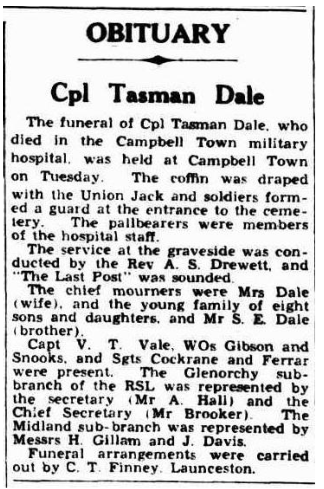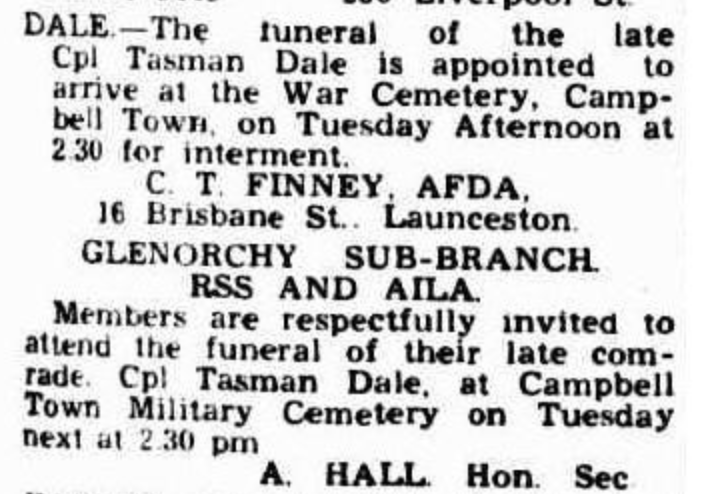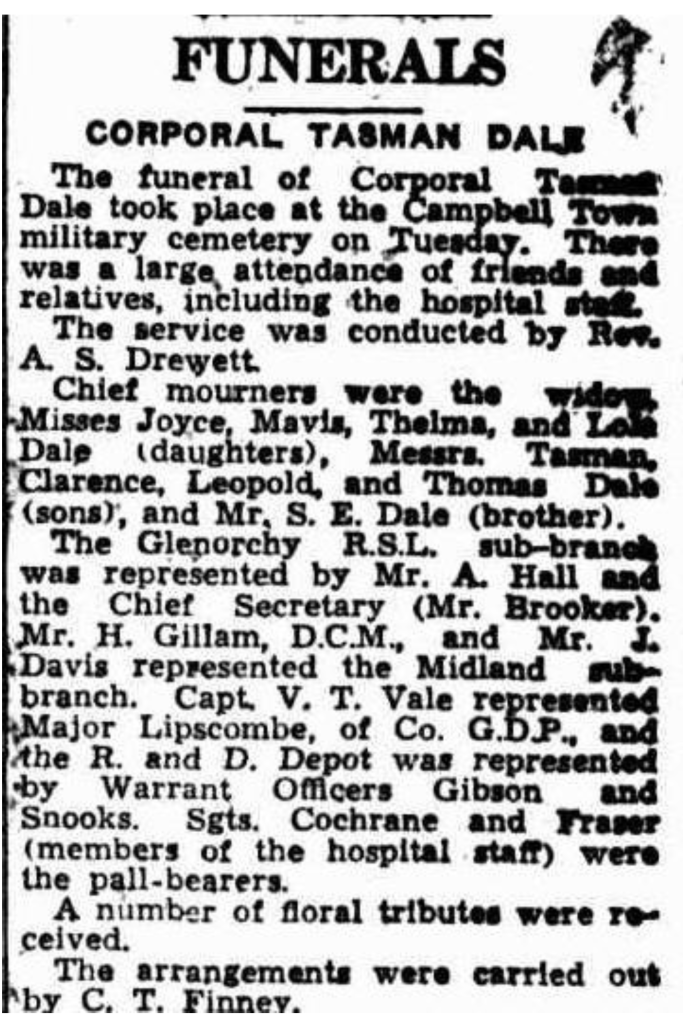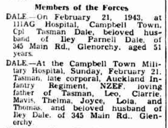 Published References (1.10.7 DALE) “Mercury” (Hobart, Tas.), Monday 22 February 1943, page 5 (“Deaths”) [Trove]. “Mercury” (Hobart, Tas.), Monday 22 February 1943, page 5 (“Deaths”) [Trove]. “Mercury” (Hobart, Tas.), Thursday 25 February 1943, page 15 [Trove]. “Examiner” (Launceston, Tas.), Saturday 27 February 1943, page 4 [Trove].