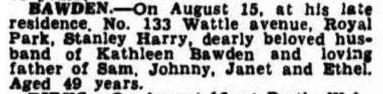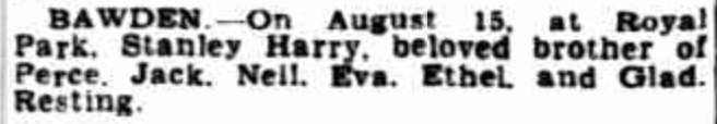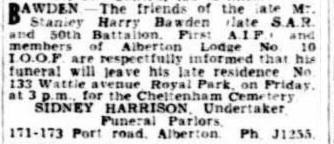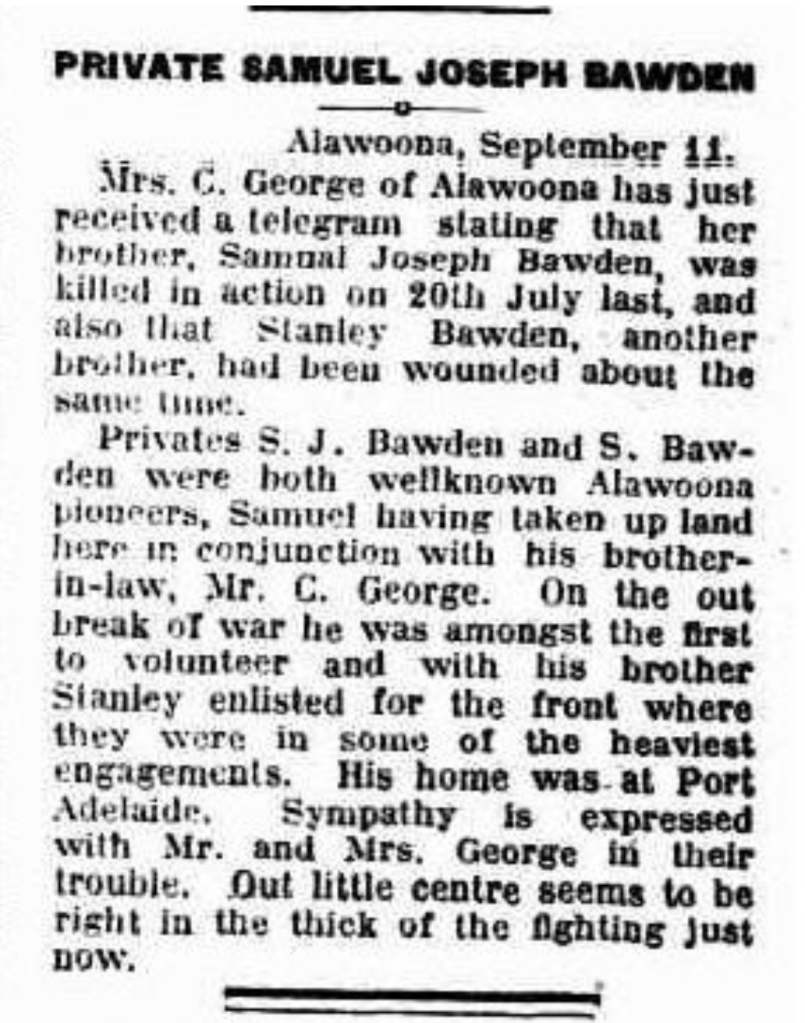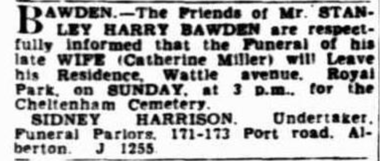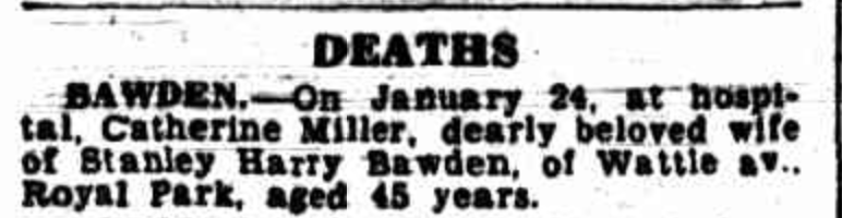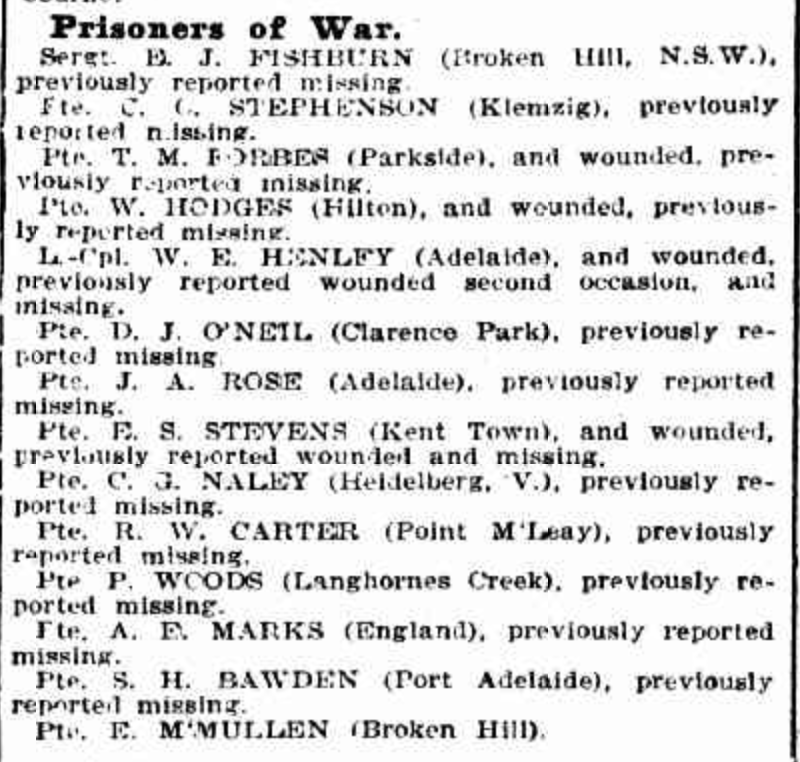 “Australian Town and Country Journal” (Sydney, NSW), Wednesday 18 July 1917, page 43 (extract from “Australian Casualties/South Australia”) [Trove].“Mail” (Adelaide, SA), Saturday 24 January 1942, page 13 (“Funeral Notices”) [Trove].“Adelaide Chronicle” (SA), Thursday 29 January 1942, page 19; also published in “Advertiser” (Adelaide SA), Monday 26 January 1942, page 12 [Trove].