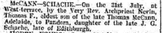 Published References (1.2.17 SCHACHE) “Chronicle” (Adelaide, SA), Saturday 23 August 1902 page 24 (“Marriages”). Also published in “Advertiser” (Adelaide, SA), Monday 18 August 1902 page 4 and “Express and Telegraph” (Adelaide, SA), same date, page 2 [Trove].
