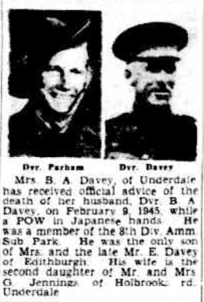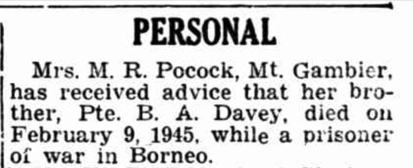 Published References (1.2.18.3 DAVEY) “Advertiser” (Adelaide, SA), Tuesday 30 October 1945, page 5 (extract from article Private Casualty Advices [Trove]. “Border Watch” (Mount Gambier, SA), Tuesday 30 October 1945, page 1 [Trove].