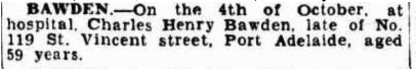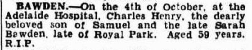 “Chronicle” (Adelaide, SA), Thursday 13 October 1938, page 27 (“Deaths”); also published in “Advertiser” (Adelaide, SA), Thursday 6 October 1938, page 14 [Trove].