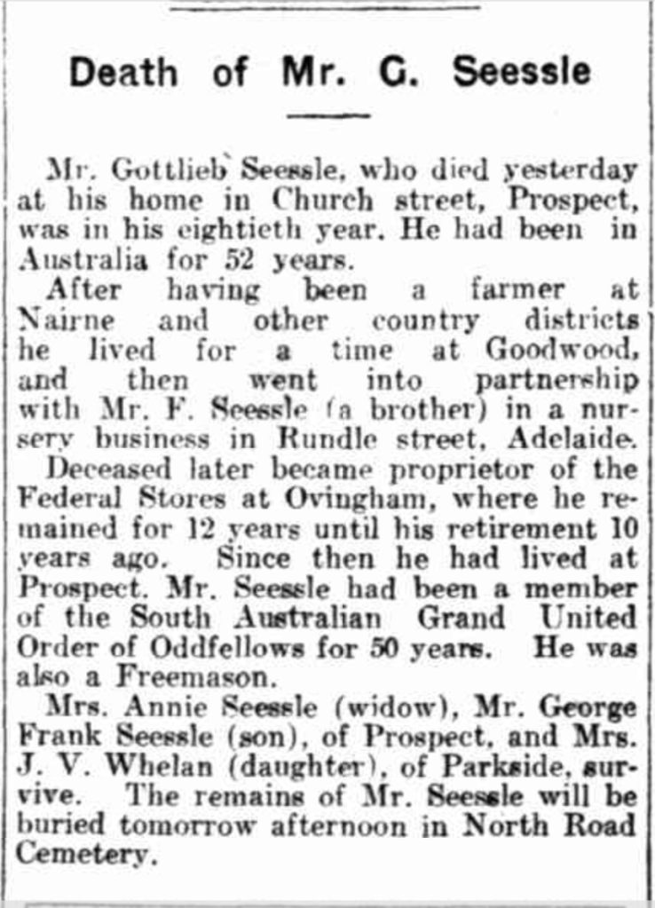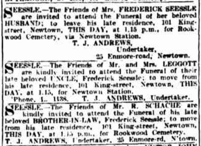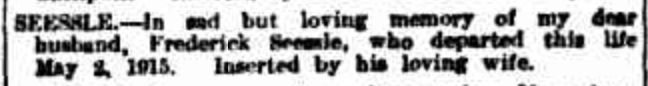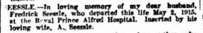 Published References (1.2.2 SCHACHE) “Sydney Morning Herald” (NSW), Tuesday 4 May 1915 page 7 (“Funeral Notices”) [Trove]. “Sydney Morning Herald” (NSW), Tuesday 2 May 1916 page 8 (“In Memoriam”) [Trove]. “Sydney Morning Herald” (NSW), Wednesday 2 May 1917 page 10 (“In Memoriam”) [Trove]. “News” (Adelaide, SA), Tuesday 29 July 1930 page 9 [Trove].