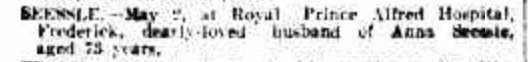 Published References (1.2.2 SCHACHE) “Daily Telegraph” (Sydney, NSW), Tuesday 23 April 1901, page 8 (part of article) [Trove]. “Australian Star” (Sydney, NSW), Tuesday 15 April 1902, page 6 [Trove]. “Sydney Morning Herald” (NSW), Tuesday 15 April 1902, page 7 [Trove]. “Sydney Morning Herald” (NSW), Tuesday 4 May 1915 page 7 (“Funeral Notices”) [Trove]. “Sydney Morning Herald” (NSW), Tuesday 4 May 1915, page 8 (“Deaths”) [Trove]. “Sydney Morning Herald” (NSW), Tuesday 2 May 1916 page 8 (“In Memoriam”) [Trove]. “Sydney Morning Herald” (NSW), Wednesday 2 May 1917 page 10 (“In Memoriam”) [Trove]. “News” (Adelaide, SA), Tuesday 29 July 1930 page 9 [Trove].