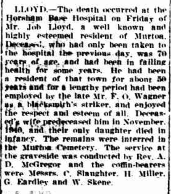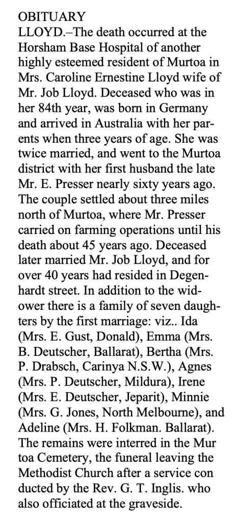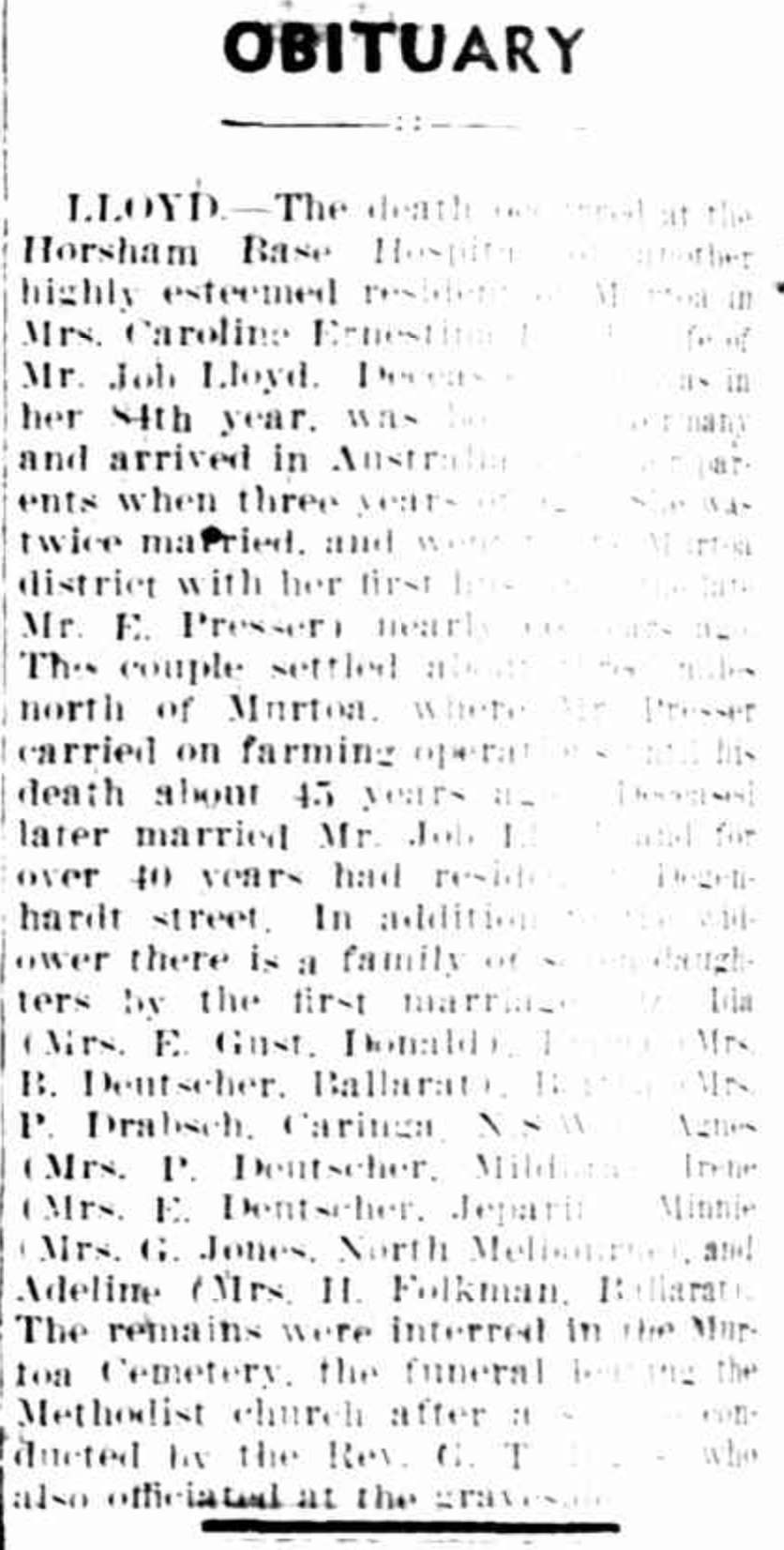 Published References (1.2.3 PRESSER) Horsham Times (Vic.), Tuesday 3 December 1940, page 2. Transcription of above with corrections [Trove]. “Horsham Times” (Vic.), Friday 1 October 1943, page 2 (extract from “Obituary”). “Murtoa and District Advertiser” (Vic.)