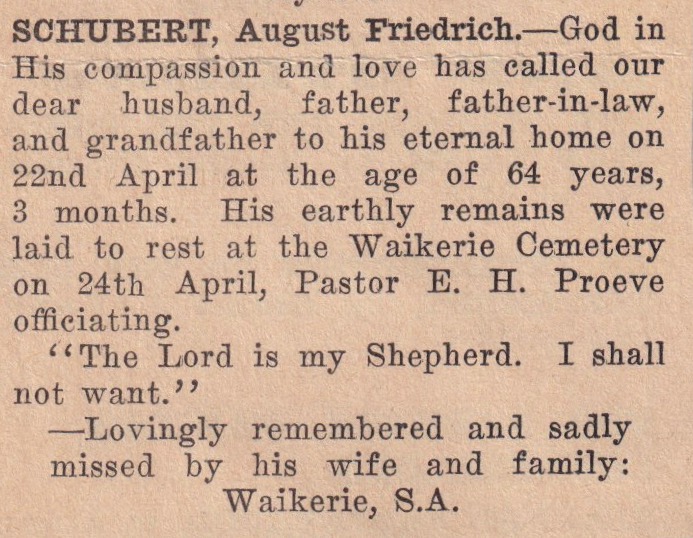 Published References (1.2.4.8 SCHUBERT) “Lutheran Herald” (Tanunda, SA), 22 May 1965, page 159. “Lutheran Herald” (Tanunda, SA), 23 April 1966, page 127.