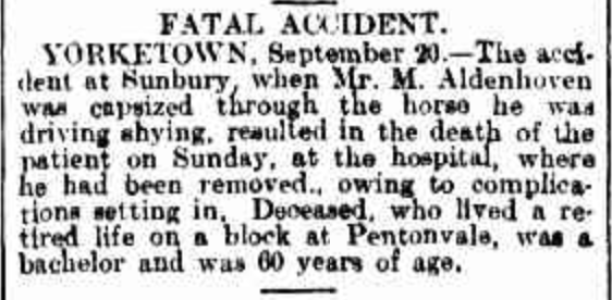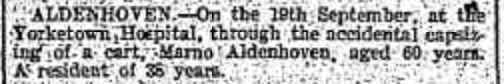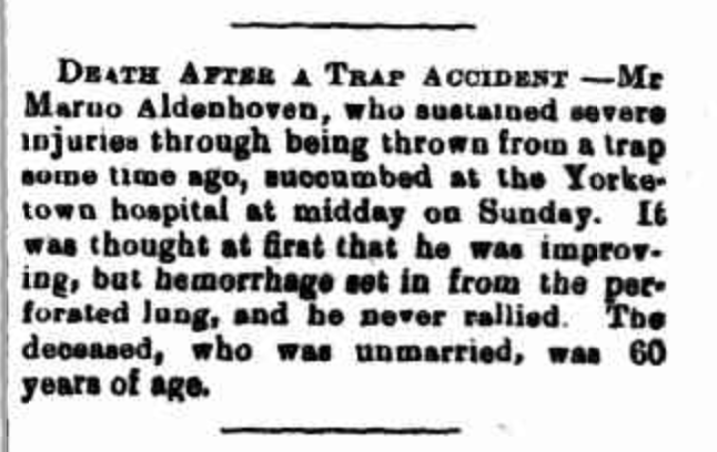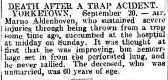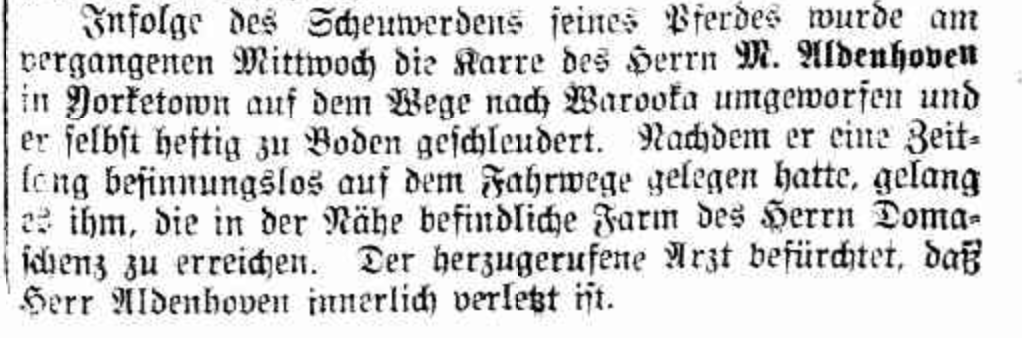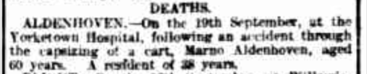“Express and Telegraph” (Adelaide, SA), Friday 3 September 1909, page 4; also published in “Advertiser” (Adelaide, SA), Friday 3 September 1909, page 8 (extract from article “Fatalities and Accidents”) [Trove].“Australische Zeitung” (Adelaide, SA), Wednesday 8 September 1909, page 6 (extract from article “Trauriges Ende eines Goldsuchers”) [Trove].“Observer” (Adelaide, SA), Saturday 11 September 1909, page 41; also published in “Register” (Adelaide, SA), Friday 3 September 1909, page 6; and “Evening Journal” (Adelaide, SA), same date and page [Trove].“Australische Zeitung” (Adelaide, SA), Wednesday 22 September 1909, page 4 (extract from article “Wetterbericht”) [Trove].