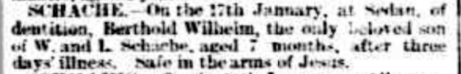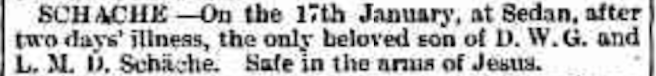 “Express and Telegraph” (Adelaide, SA), Wednesday 22 January 1896, page 3 (“Deaths”); also published in “Advertiser” (Adelaide, SA), Wednesday 22 January 1896, page 4 and Wednesday 29 January 1896, page 7 [Trove].