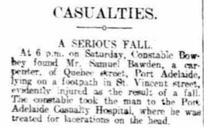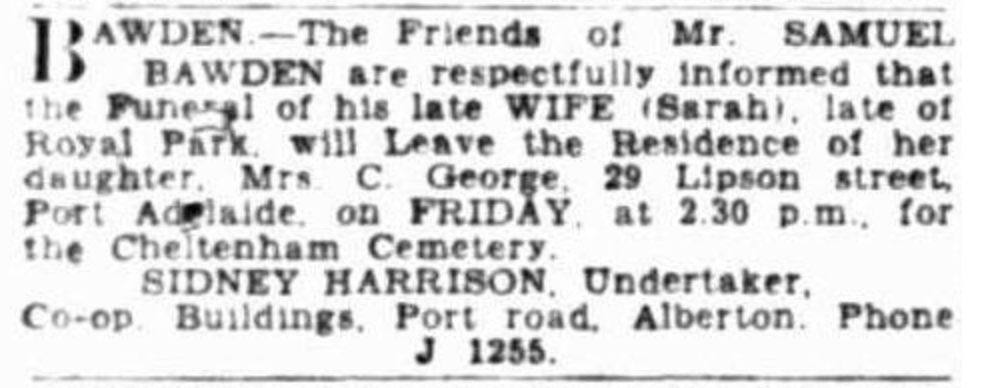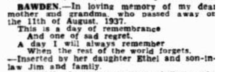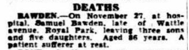 Published References (1.2 BAWDEN) “Register” (Adelaide, SA), Monday 27 May 1918 page 5 [Trove]. “News” (Adelaide, SA), Thursday 12 August 1937 page 4 (“Funeral Notices”) [Trove]. “Chronicle” (Adelaide, SA), Thursday 19 August 1937 page 25 (“Deaths”). Also published in “Advertiser” (Adelaide, SA) Friday 13 August 1937 page 16 [Trove]. “Advertiser” (Adelaide, SA), Thursday 11 August 1938 page 12 (“In Memoriam”) [Trove]. “Advertiser” (Adelaide, SA), Friday 28 November 1941 page 16 [Trove].