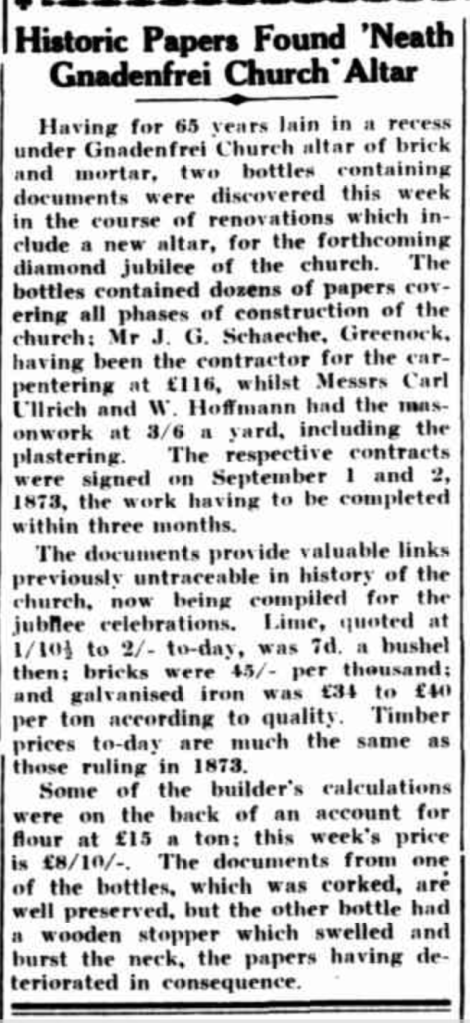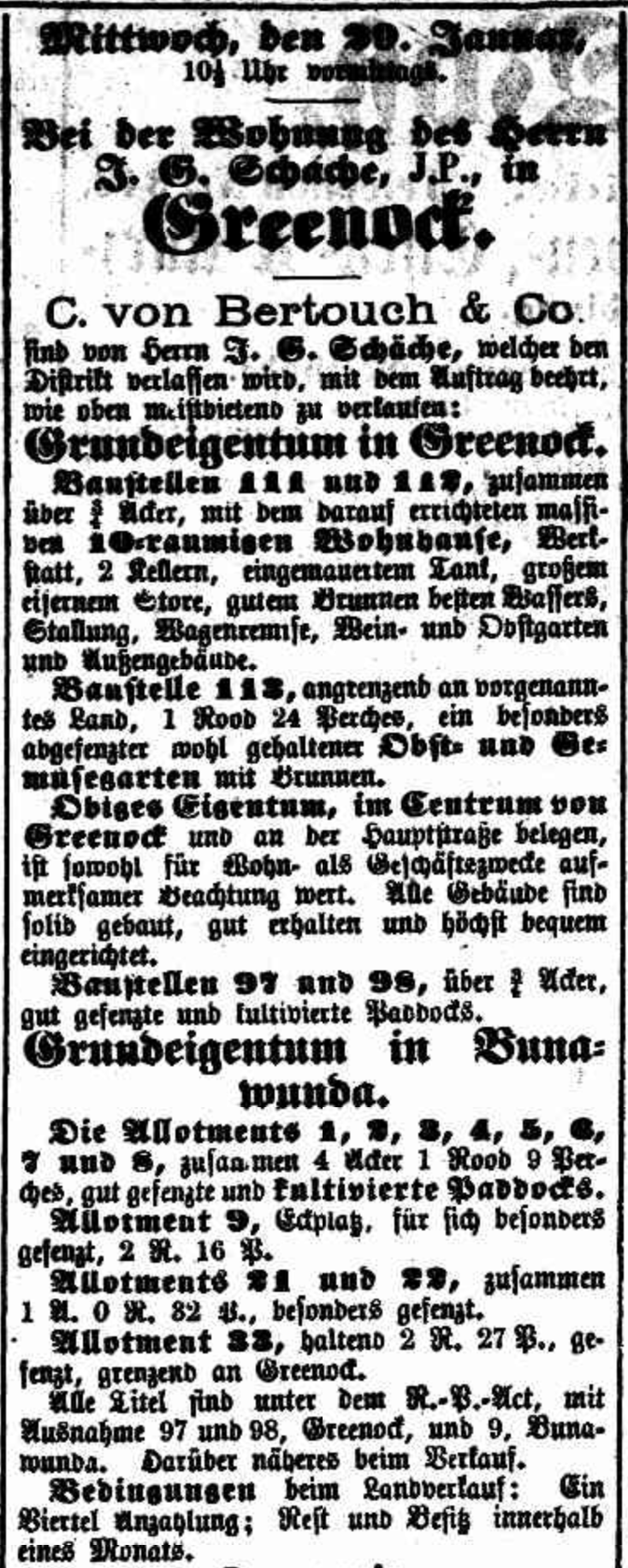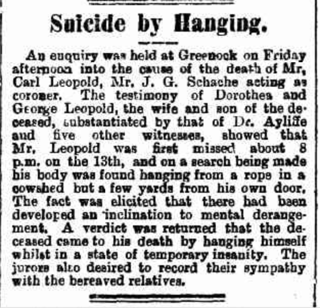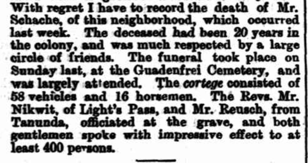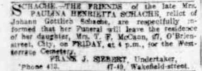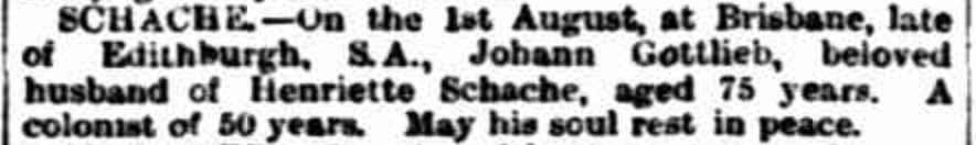 “South Australian Chronicle and Weekly Mail” (Adelaide, SA), Saturday 12 December 1868, page 7 (extract from article “Greenock., December 9”). The article actually records the death of Rosina Schache (Ulbrich). [Trove].