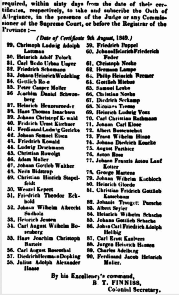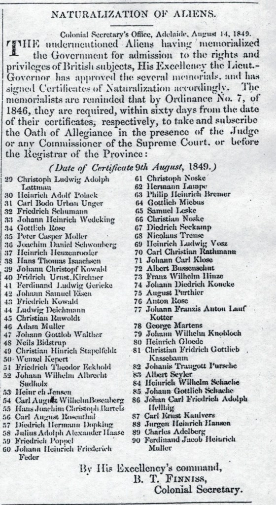 “South Australian Register” (Adelaide, SA), Saturday 18 August 1849, page 3 (“Government Gazette Notices”). Also published in “Adelaide Observer” (SA), same date, pages 1-2 [Trove].