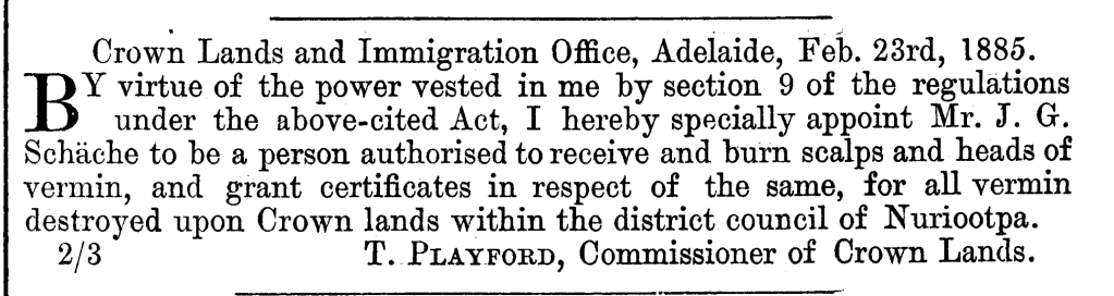 “South Australian Government Gazette”, 5 March 1885, page 830 [extract from item “The Vermon Destruction Amendment Act, 1884”) [https://www8.austlii.edu.au/au/other/sa_gazette/1885/10.pdf].
