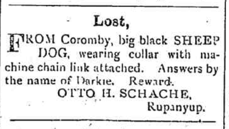 Published References (1.3.1.3 SCHACHE) “Dunmunkle Standard” (Murtoa, Vic.), Friday 27 February 1914, page 5 (underneath “Fatal Buggy Accident”) [Trove]; also published in “Horsham Times” (Vic.), Tuesday 3 March 1914, page 5 (extract from “Property Sale”). “Dunmunkle Standard” (Murtoa, Vic.), Friday 1 February 1918, page 2 (“Advertising”) [Trove].