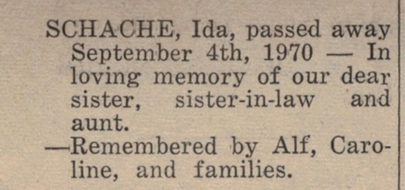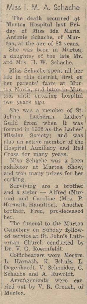 Published References (1.3.5.1 SCHACHE) “Dunmunkle Standard and Murtoa Advertiser”, c. 1940s. “Lutheran Herald” (Tanunda, SA), 27 October 1962 (extract from article “Victoria/St. John’s Ladies Guild’s 60th Anniversary, Murtoa”). “Dunmunkle Standard” (Murtoa, Vic.), Tuesday 8 September 1970, page 2 (extract from article “District Obituaries”). “Dunmunkle Standard” (Murtoa, Vic.), Tuesday 9 September 1969, page 3. “Dunmunkle Standard” (Murtoa, Vic.), Tuesday 13 October 1970, page 4. “Dunmunkle Standard” (Murtoa, Vic.), Tuesday 31 August 1971, page 4 (“In Memoriam”).