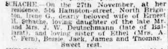 Published References (1.3.6.7 SCHACHE) “Age” (Melbourne, Vic.), Wednesday 29 November 1933, page 1 (“Deaths”) [Trove]. Argus” (Melbourne, Vic.), Wednesday 29 November 1933, page 1, (“Funeral Notices”) [Trove].
