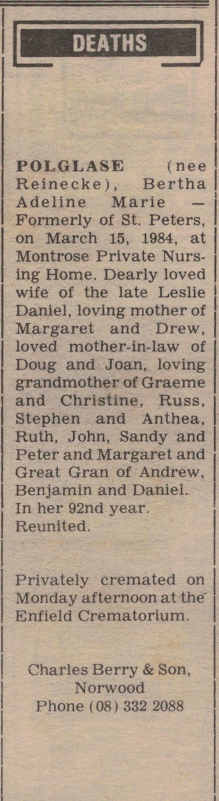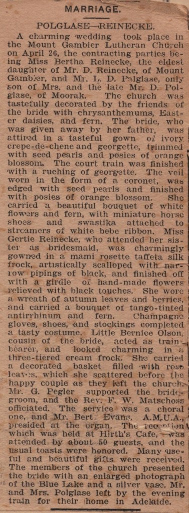 Published References (1.3.9.1 REINECKE) “Border Watch” (Mount Gambier, SA), Tuesday 16 May 1922, page 4 [ “Dunmunkle Standard and Murtoa Advertiser” (Vic.), Friday 5 September 1958. “Border Watch” (Mount Gambier, SA), Tuesday 20 March 1984, page 28.