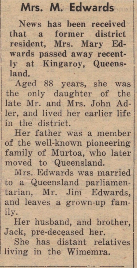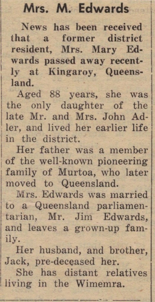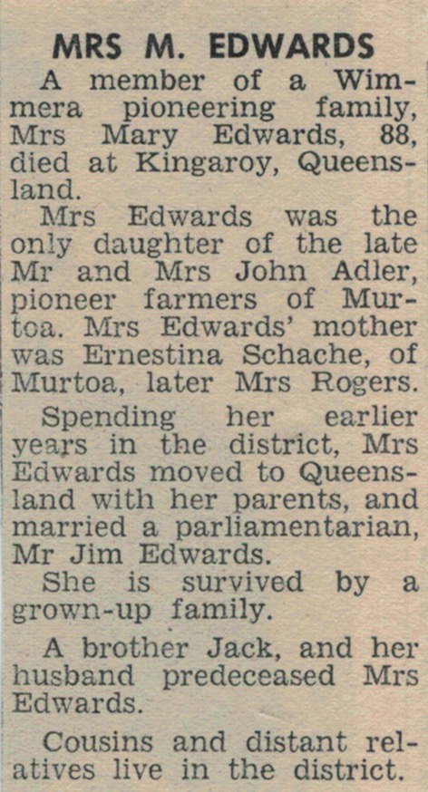 Published References (1.4.1 ADLER) “South Burnett Times” (Kingaroy, Qld.), Wednesday 26 July 1947, page 42. “Mail-Times” (Horsham, Vic.), 6 March 1968, page 11 (extract from article “Obituaries”) [JAS]. “Dunmunkle Standard” (Murtoa, Vic.), Tuesday March 12, 1968, page 2 (extract from article “Obituaries”)[JAS].