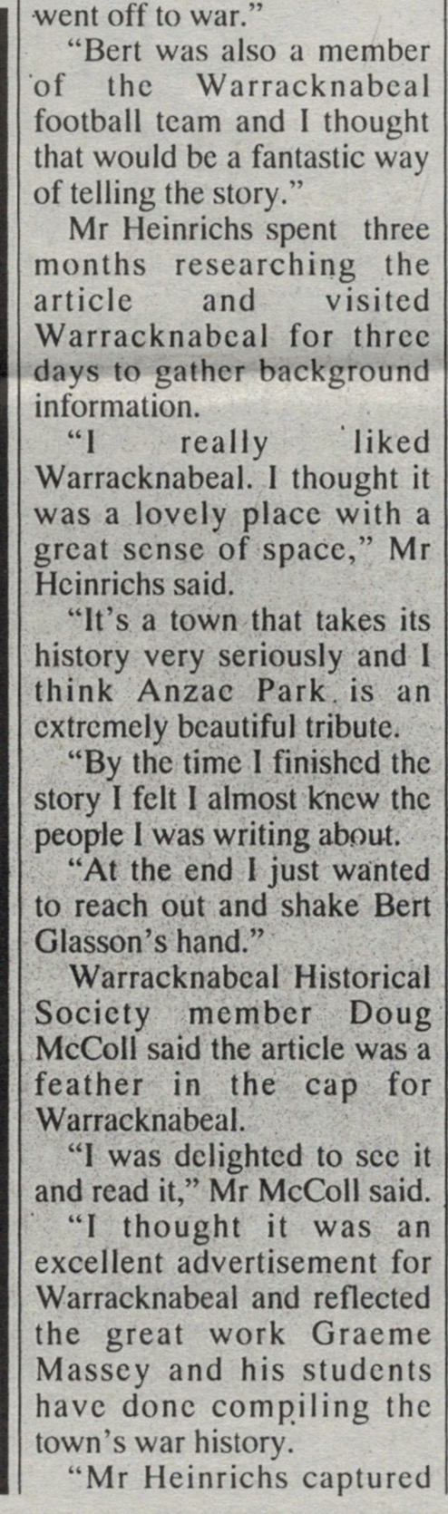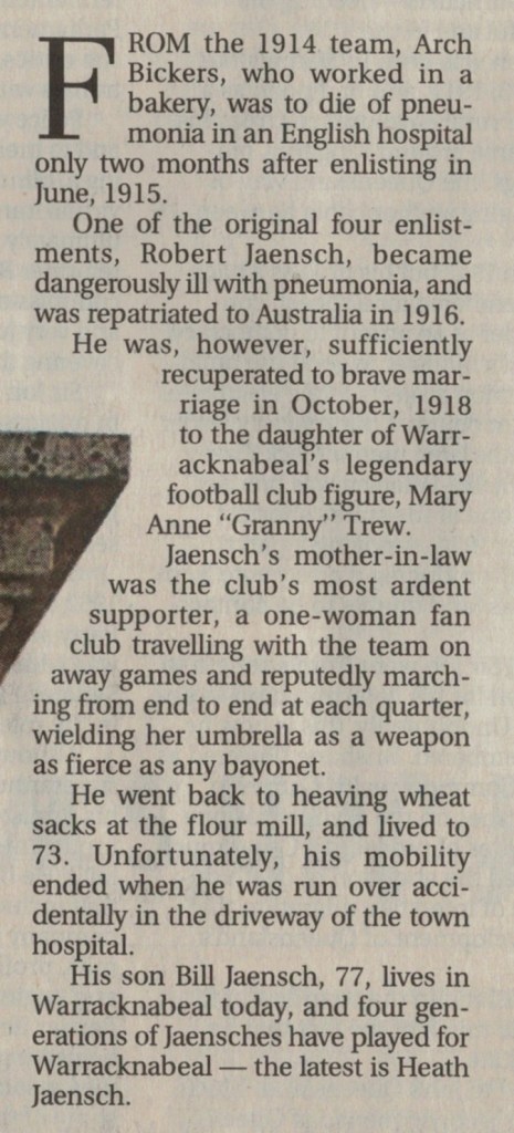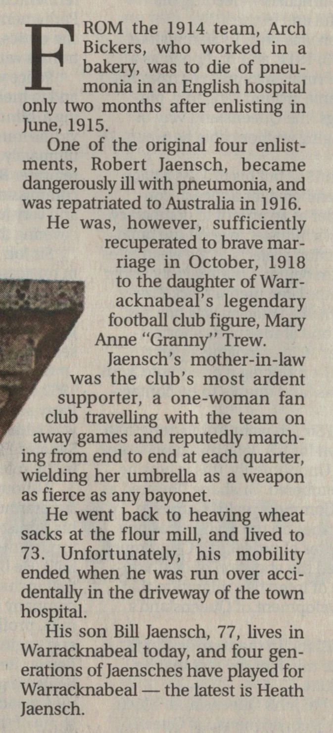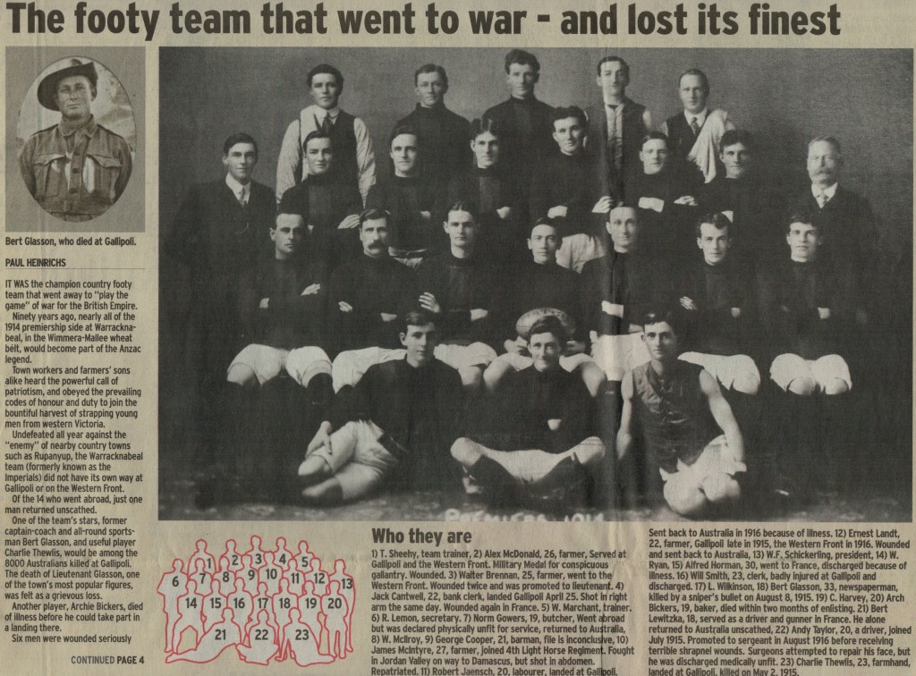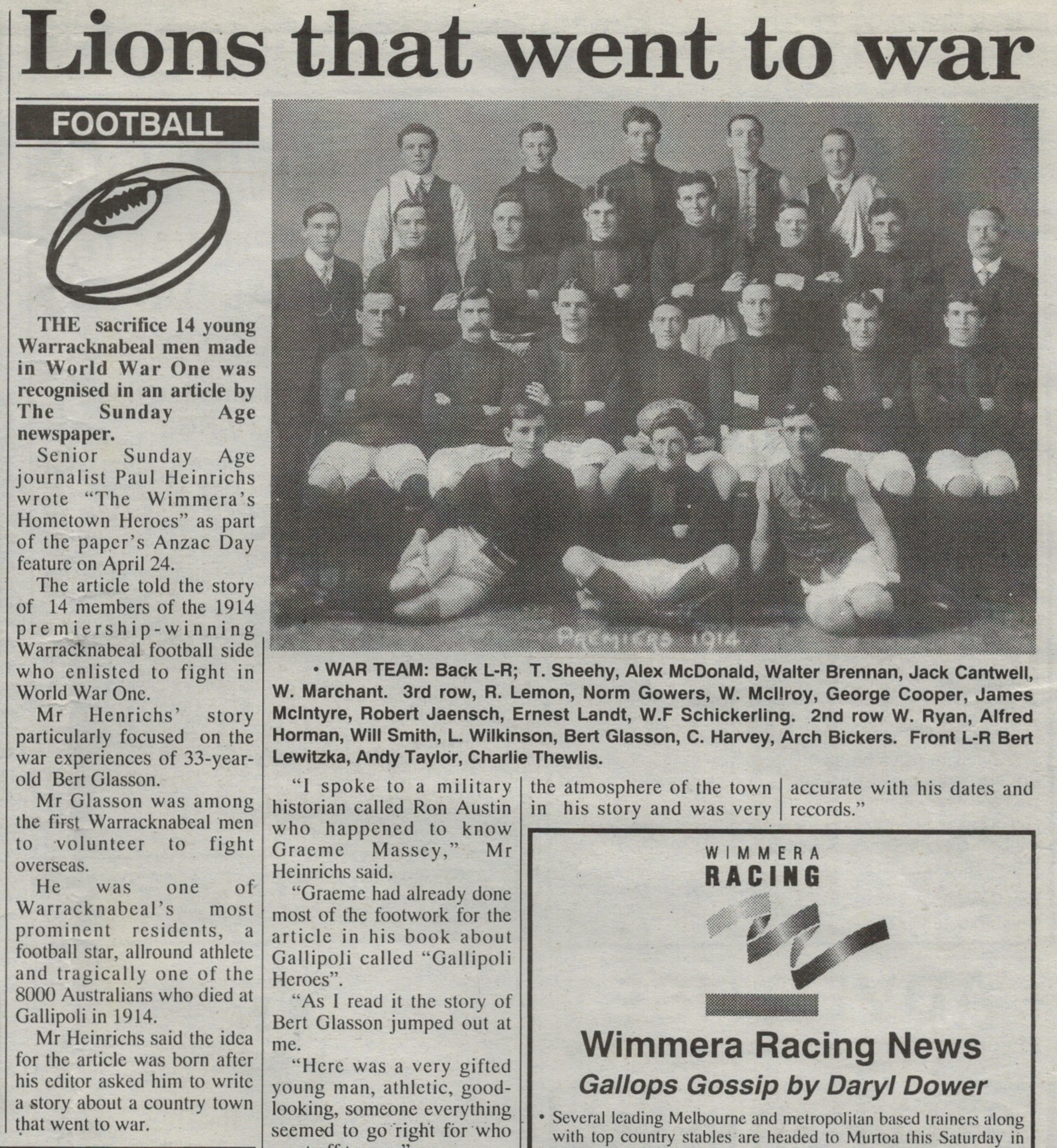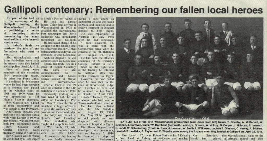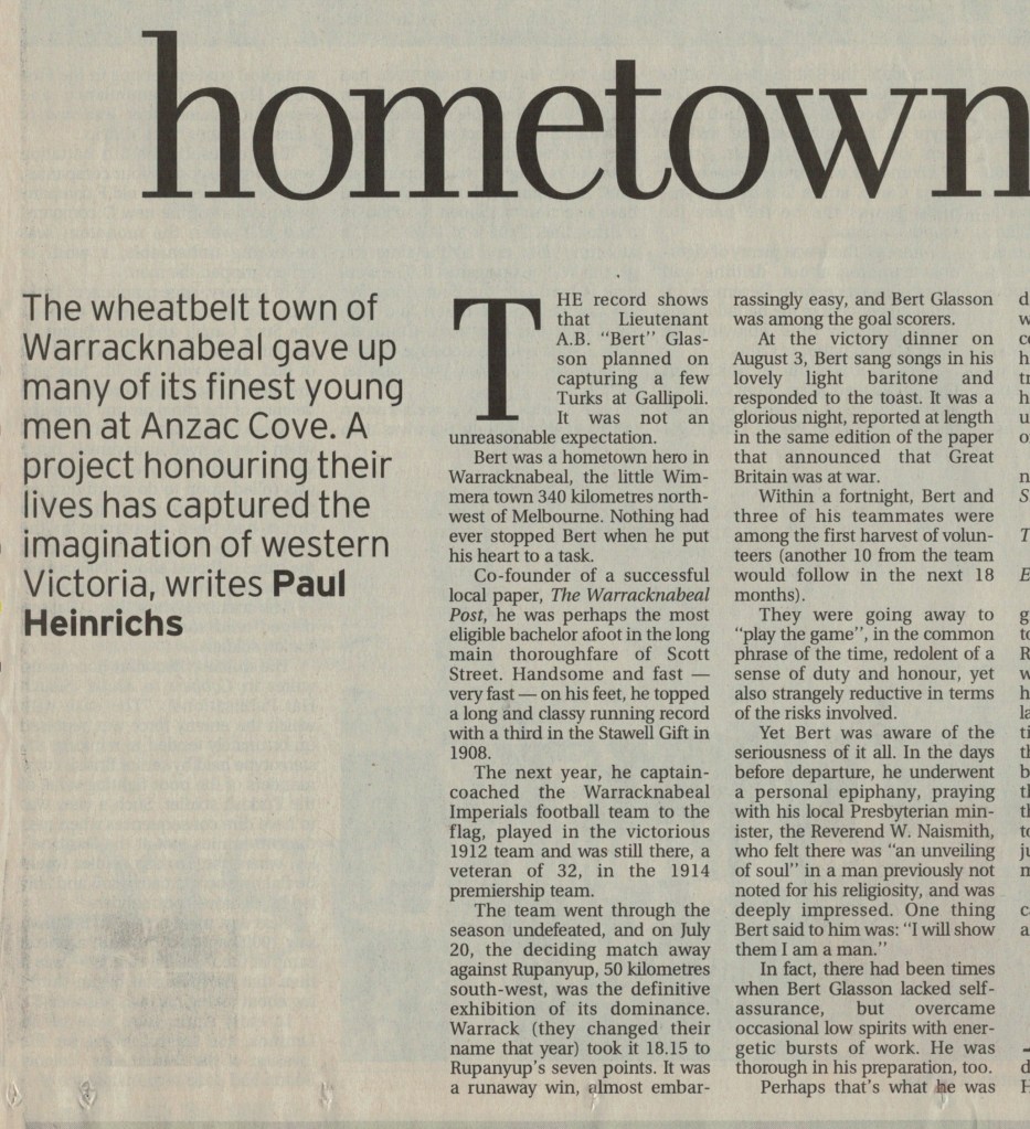 Published References (1.4.3 TREW) “Sunday Age” (Melbourne, Vic.), 24 April 2005, page 1; (same paper as the following extracts from the Gallipoli 90th anniversary report. “Sunday Age” (Melbourne, Vic.), 24 April 2005, page 12: Gallipoli 90th anniversary report, “The Wimmera’s hometown heroes” (part article). As above, page 13 “Warracknabeal Herald” (Vic.), Friday 20 May 2005, page 14. “Warracknabeal Herald” (Vic.), Friday 24 April 2015, page 6 (part article).