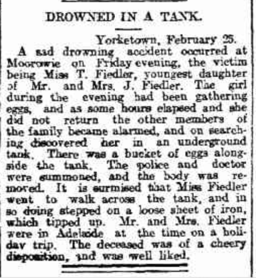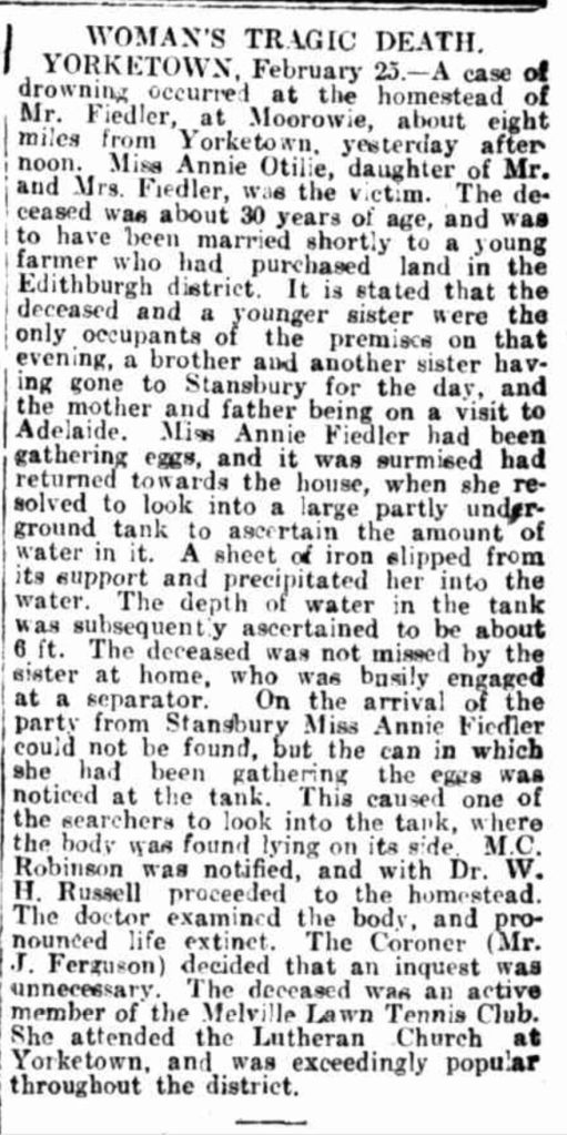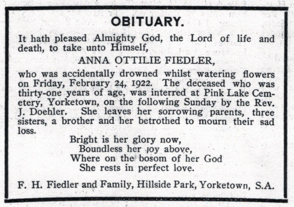 Published References (1.4.4.3 FIEDLER) “Express and Telegraph” (Adelaide, SA), Tuesday 28 February 1922, page 3. “Observer” (Adelaide, SA), Saturday 4 March 1922, page 21. Also published in “Register” (Adelaide, SA), Wednesday 1 March 1922, page 6; “Journal” (Adelaide, SA), same date, page 2; “Yorke’s Peninsula Advertiser (Moonta, SA), Friday 3 March 1922, page 2. “Lutheran Herald” (Tanunda, SA), 27 March 1922, page 112.