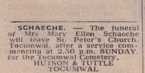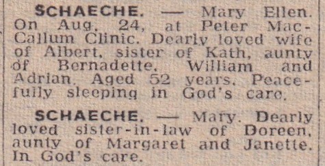 Published References (1.4.8.9 SCHAECHE) “Sun” (Melbourne, Vic.), Saturday 26 August 1978 (“Deaths”). “Sun” (Melbourne, Vic.), Saturday 26 August 1978, page 52 (“Funerals”).