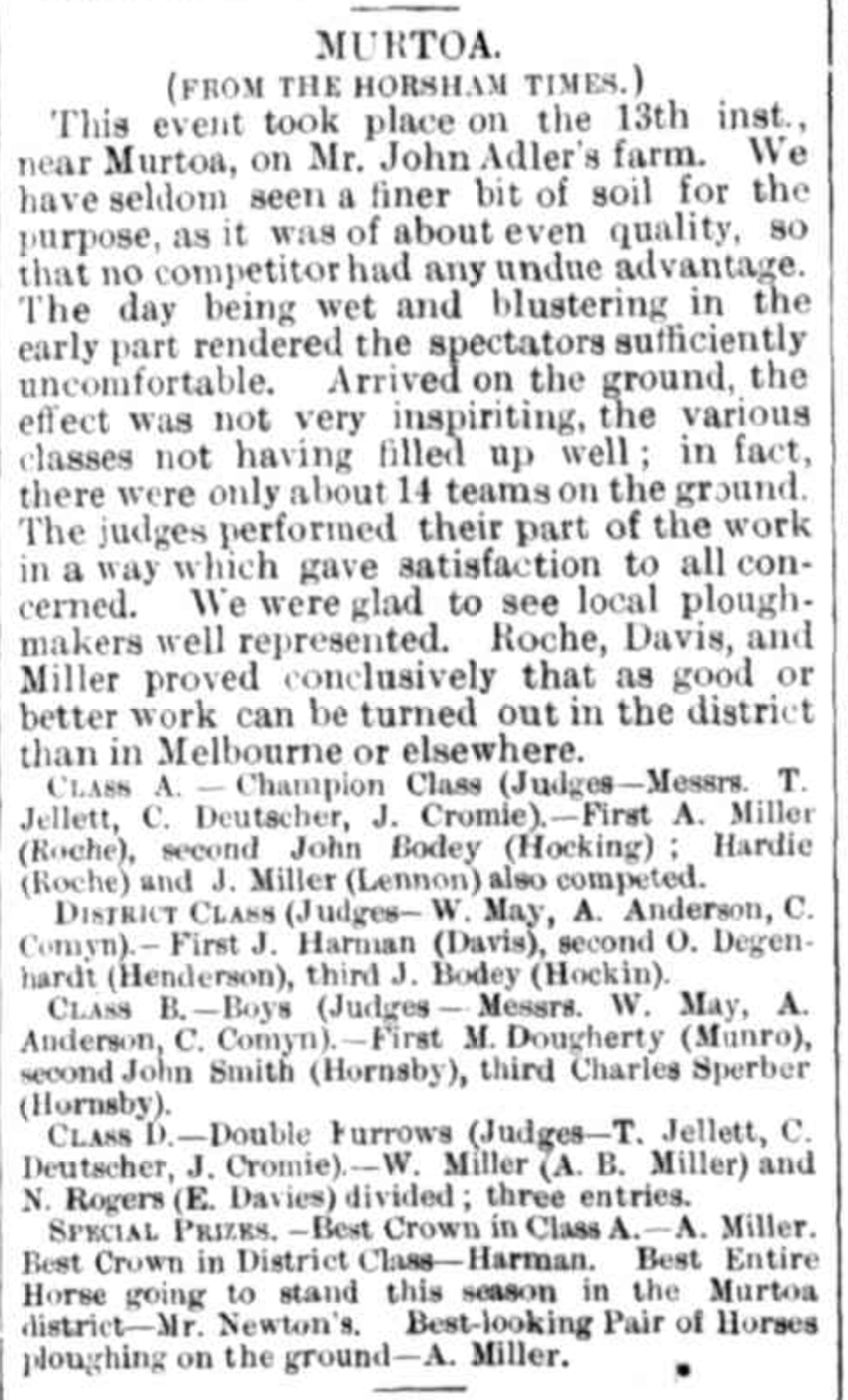 “Horsham Times” (Vic.), Friday 16 September 1887, page 3 (extract from article “Murtoa Show”) [Trove].