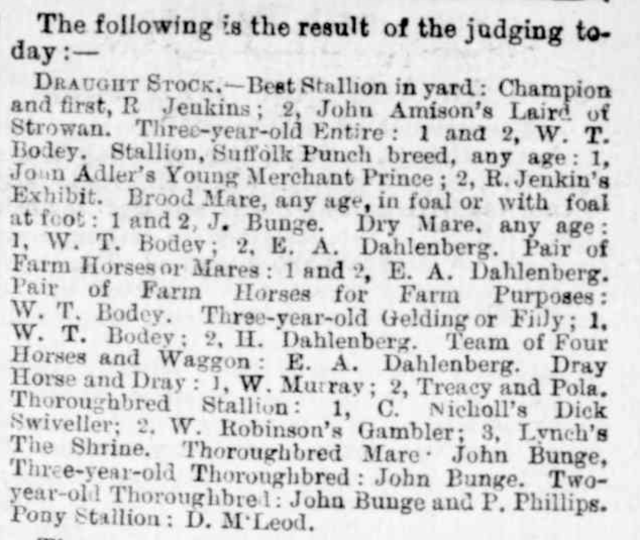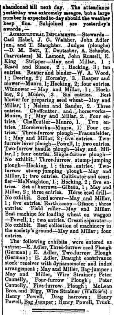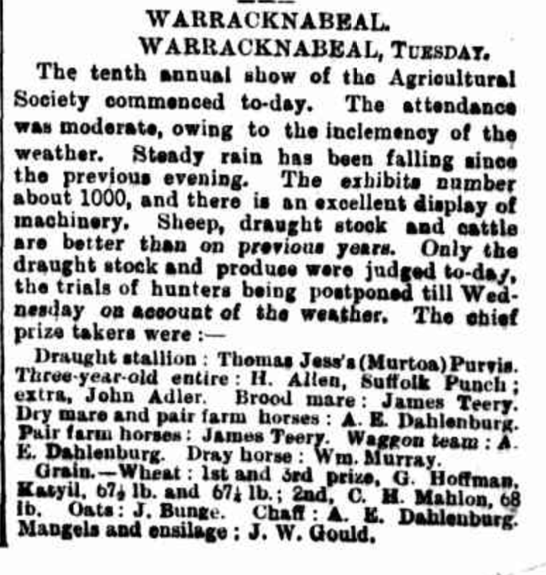 “Weekly Times” (Melbourne, Vic.0, Saturday 6 October 1894, page 31 (extract from article “Warracknabeal” – a report of the Warracknabeal Agricultural Show) [Trove].