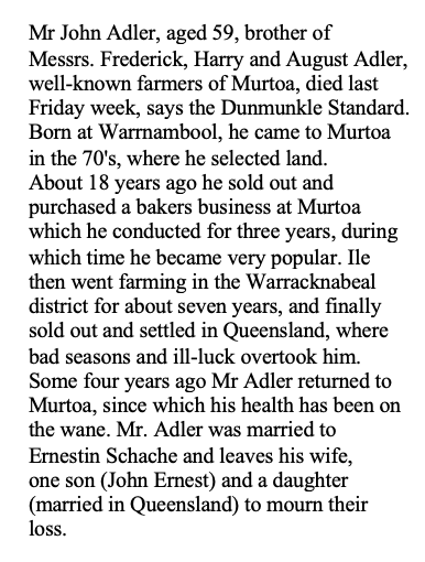“Horsham Times” (Vic.), Tuesday 27 September 1910, page 6 (extract from article “Obituary”) [transcription from Trove with corrections].