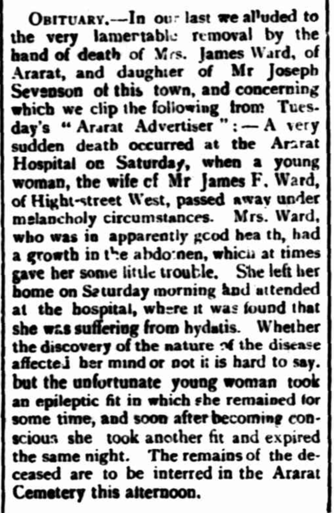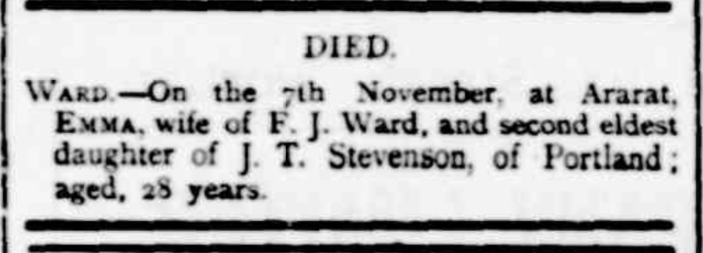Published References (1.4 WARD) “Portland Guardian” (Vic.), Monday 9 November 1896, page 2 [Trove]. “Portland Guardian” (Vic.), Wednesday 11 November 1896, page 2 [Trove]