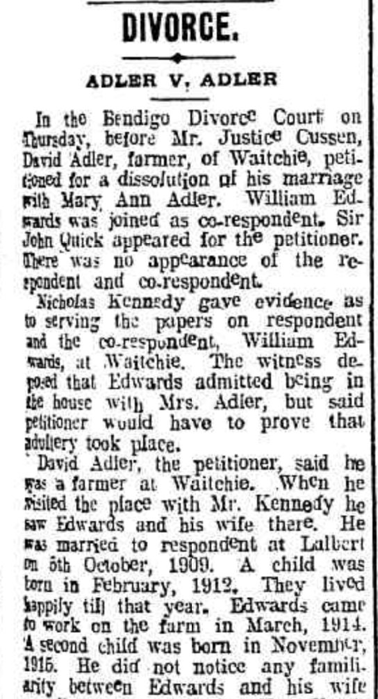 Published References (1.5.1 ADLER) “Swan Hill Guardian and Lake Boga Advocate” (Vic.), Monday 6 August 1917, page 3 [Trove]. “Cootamundra Herald” (NSW), Thursday 11 September 1947, page 2 [Trove].