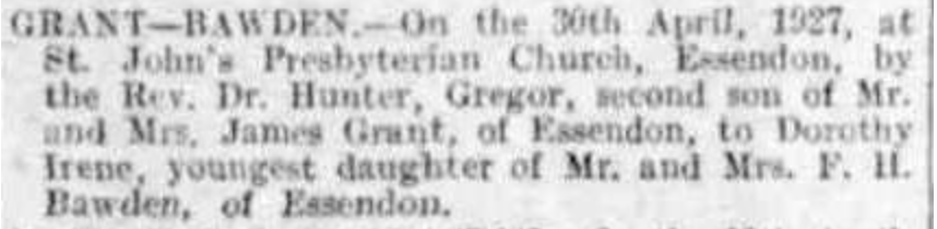“Australasian” (Melbourne Vic.), Saturday 11 June 1927, page 3 (“Marriages”) [Trove]; also published in “Argus” (Melbourne, Vic.), Saturday 4 June 1927, page 11.
