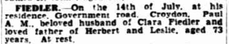 Published References (1.5.5 FIEDLER) “Advertiser” (Adelaide, SA), Saturday 16 July 1938, page 16 (“Deaths”).