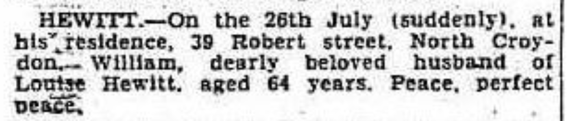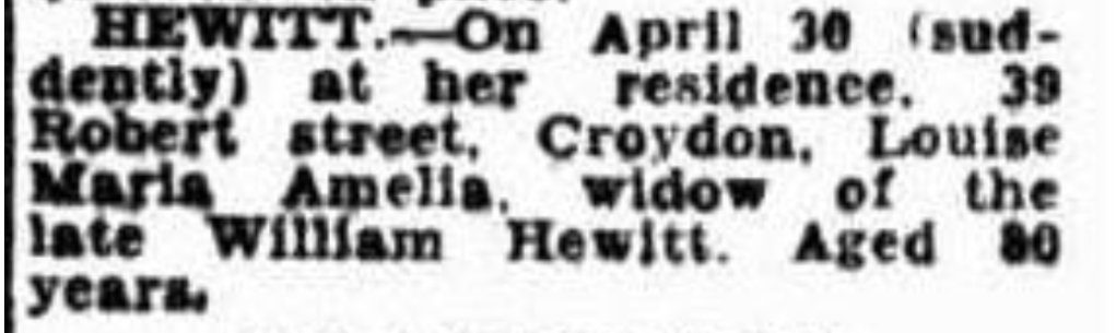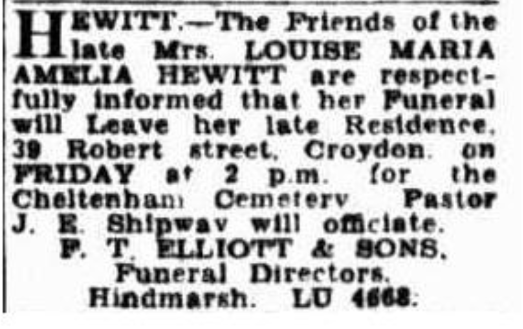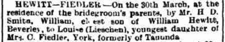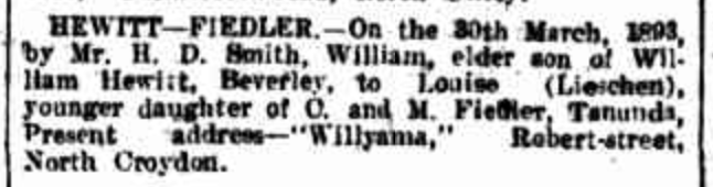 Published References (1.5.8 FIEDLER) “Express and Telegraph” (Adelaide, SA), Tuesday 4 April 1893 (“Marriages”) [Trove]. “Chronicle” (Adelaide, SA), Saturday 6 April 1918, page 27 (“Silver Weddings”) [Trove]. “News” (Adelaide, SA), Saturday 27 July 1935, page 8 (“Deaths”); also published in “Mail” (Adelaide, SA), same date, page 2 [Trove]. “News” (Adelaide, SA), Saturday 27 July 1935, page 8 (“Funeral Notices”); also published in “Mail” (Adelaide, SA), same date, page 2 [Trove]. “News” (Adelaide, SA), Thursday 1 May 1952, page 19 (“Deaths”) [Trove]. “News” (Adelaide, SA), Thursday 1 May 1952, page 19 (“Funeral Notices”) [Trove].