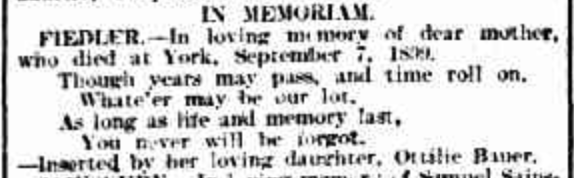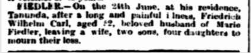 “South Australian Advertiser” (Adelaide, SA), Tuesday 29 June 1886, page 4 (“Deaths”). Also published in “South Australian Weekly Chronicle” (Adelaide, SA), Saturday 3 July 1886, page 4 (“Deaths”).