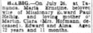 Published References (1.6.2.2 HELBIG) “Lutheran Herald” (Tanunda, SA), 13 December 1952, page 368. “Advertiser” (Adelaide, SA), Monday 27 July 1953, page 16 (“Deaths”) [Trove]. “Leader” (Angaston, SA), Thursday 6 August 1953, page 3 [Trove].