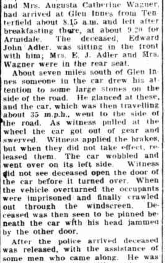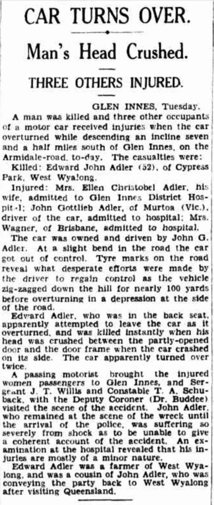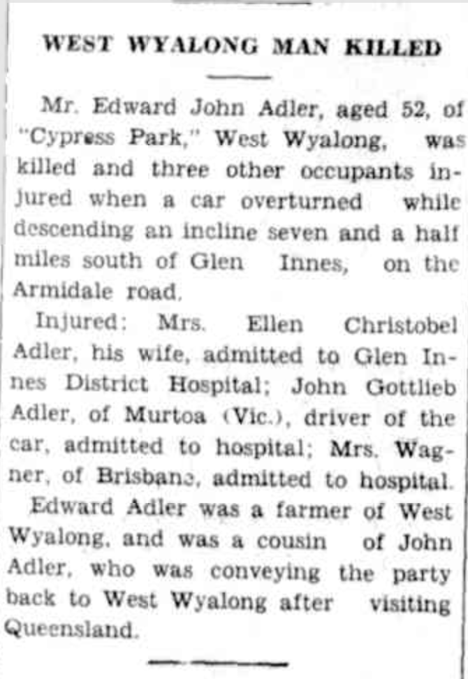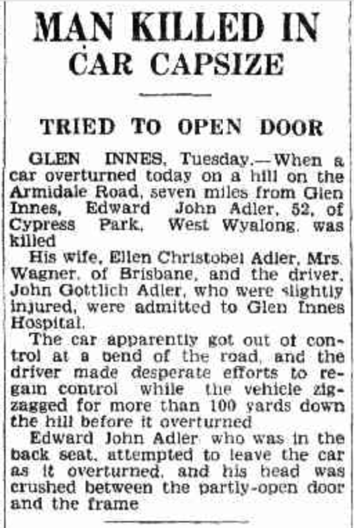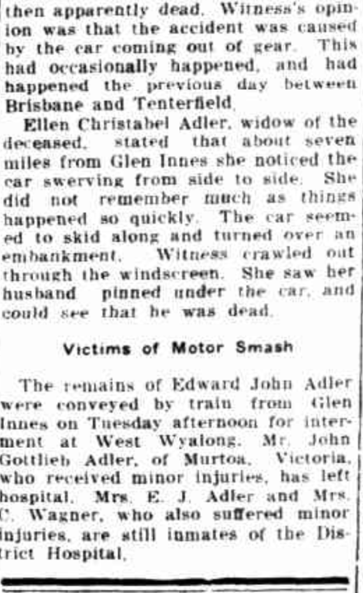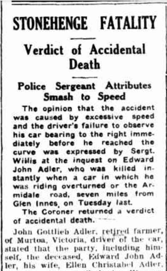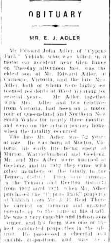 Published References (1.6.2 ADLER) “Sydney Morning Herald” (NSW), Wednesday 26 August 1936, page 14 [Trove]. “Daily Telegraph” (Sydney, NSW), Wednesday 26 August 1936, page 7 [Trove]. “Cootamundra Herald” (NSW), Thursday 27 August 1936, page 2 [Trove]. “Armidale Express and New England Avertiser (NSW), Friday 28 August 1936, page 3 [Trove]. “West Wyalong Advocate” (NSW), Tuesday 1 September 1936, page 1.