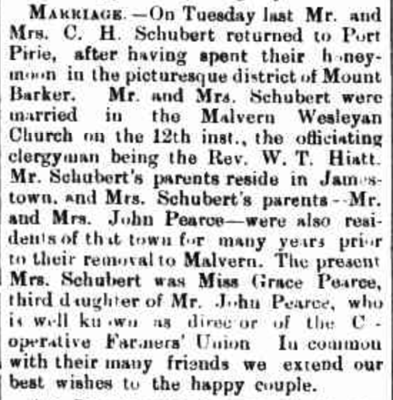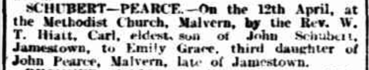 Published References (1.6.2 SCHUBERT) “Advertiser” (Adelaide, SA), Wednesday 25 April 1900, page 4 (“Marriages”). “Port Pirie Recorder and North Western Mail” (SA), Saturday 28 April 1900, page 2 (extract from article) [Trove].