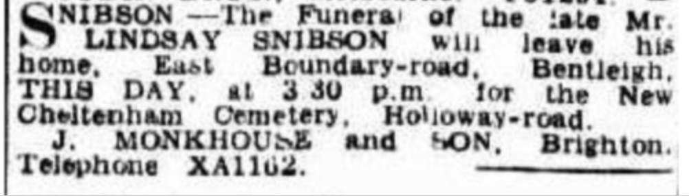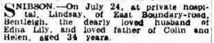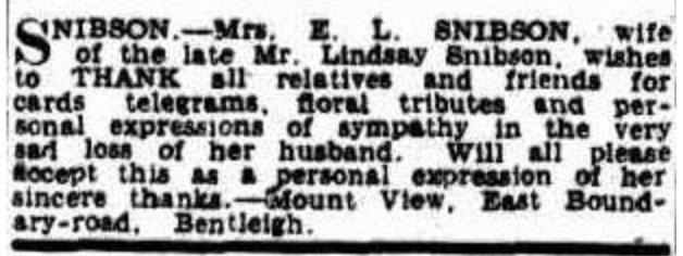 Published References (1.6.7 SNIBSON) “Age” (Melbourne, Vic.), Friday 25 July, 1947, page 9 (“Deaths”); also published in “Argus” (Melbourne, Vic.), same date, page 13 [Trove]. “Age” (Melbourne, Vic.), Friday 25 July, 1947, page 9 (“Funeral Notices”); also published in “Argus” (Melbourne, Vic.), same date, page 13 [Trove]. “Age” (Melbourne. Vic.), 22 August, 1947, page 9 (“Bereavement Notices”) [Trove].