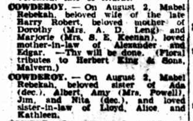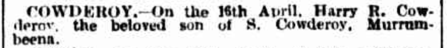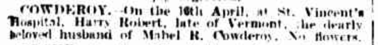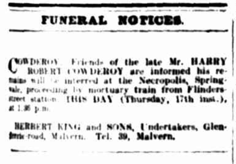 Published References (1.6 COWDEROY) “Age” (Melbourne, Vic), Thursday 17 April 1913, page 1 (“Deaths”); also published in “Argus” (Melbourne, Vic.), same date, page 1 (“Deaths”) and “Australasian” (Melbourne, Vic.), Saturday 26 April 1913, page 60 (“Deaths”) [Trove]. “Argus” (Melbourne, Vic), Thursday 17 April 1913, page 1 [Trove]. “Age” (Melbourne, Vic), Saturday 19 April 1913, page 5 (“Deaths”) [Trove]. “Argus” (Melbourne, Vic.), Wednesday 4 August 1948, page 2 (“Deaths”) [Trove].