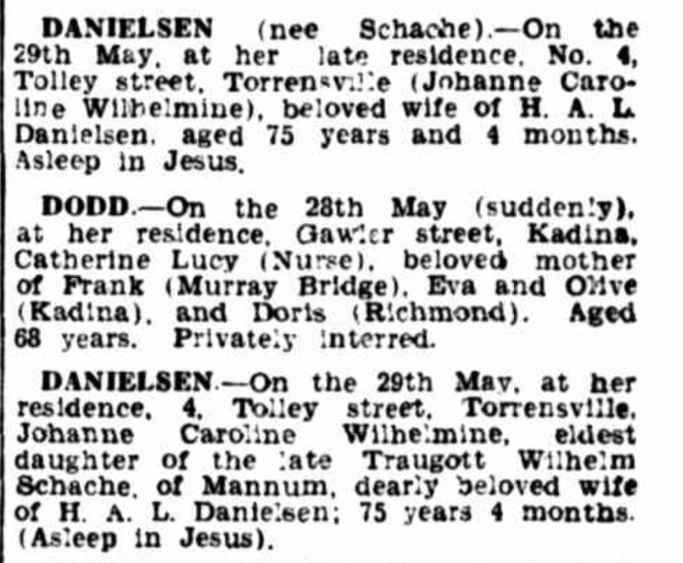 Published References (1.7.2 SCHACHE) “Chronicle” (Adelaide, SA), Thursday 1 June 1933, page 39 (“Deaths”) [Trove].