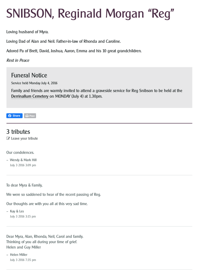 Published references (1.7.7.1 SNIBSON) “Herald Sun” (Melbourne, Vic.), Thursday 30 June 2016 (“Deaths”).