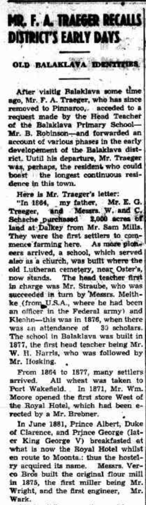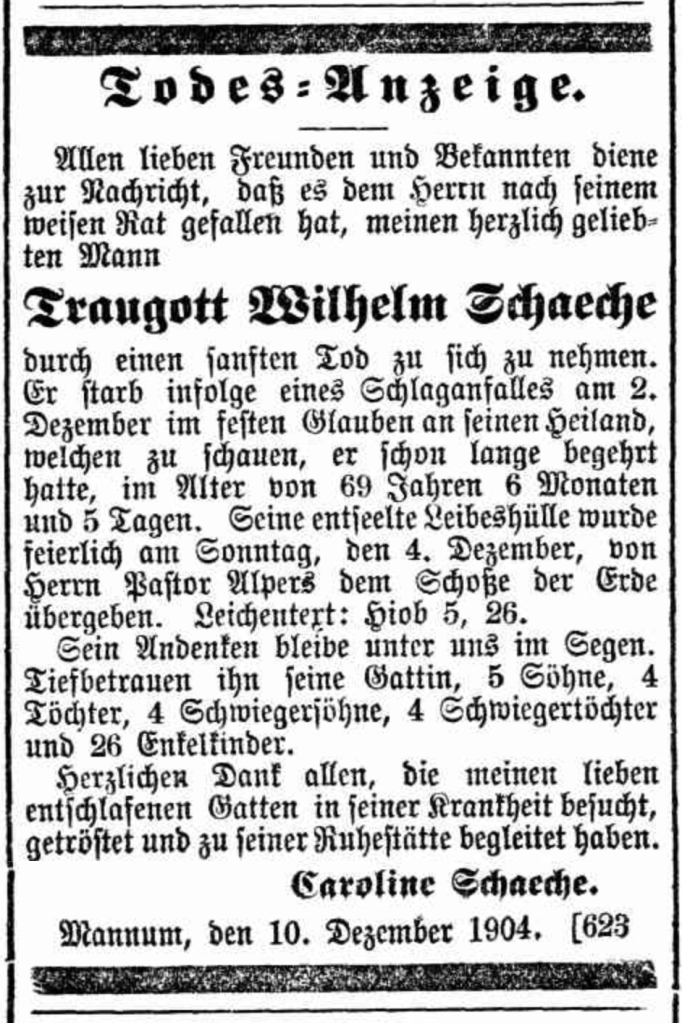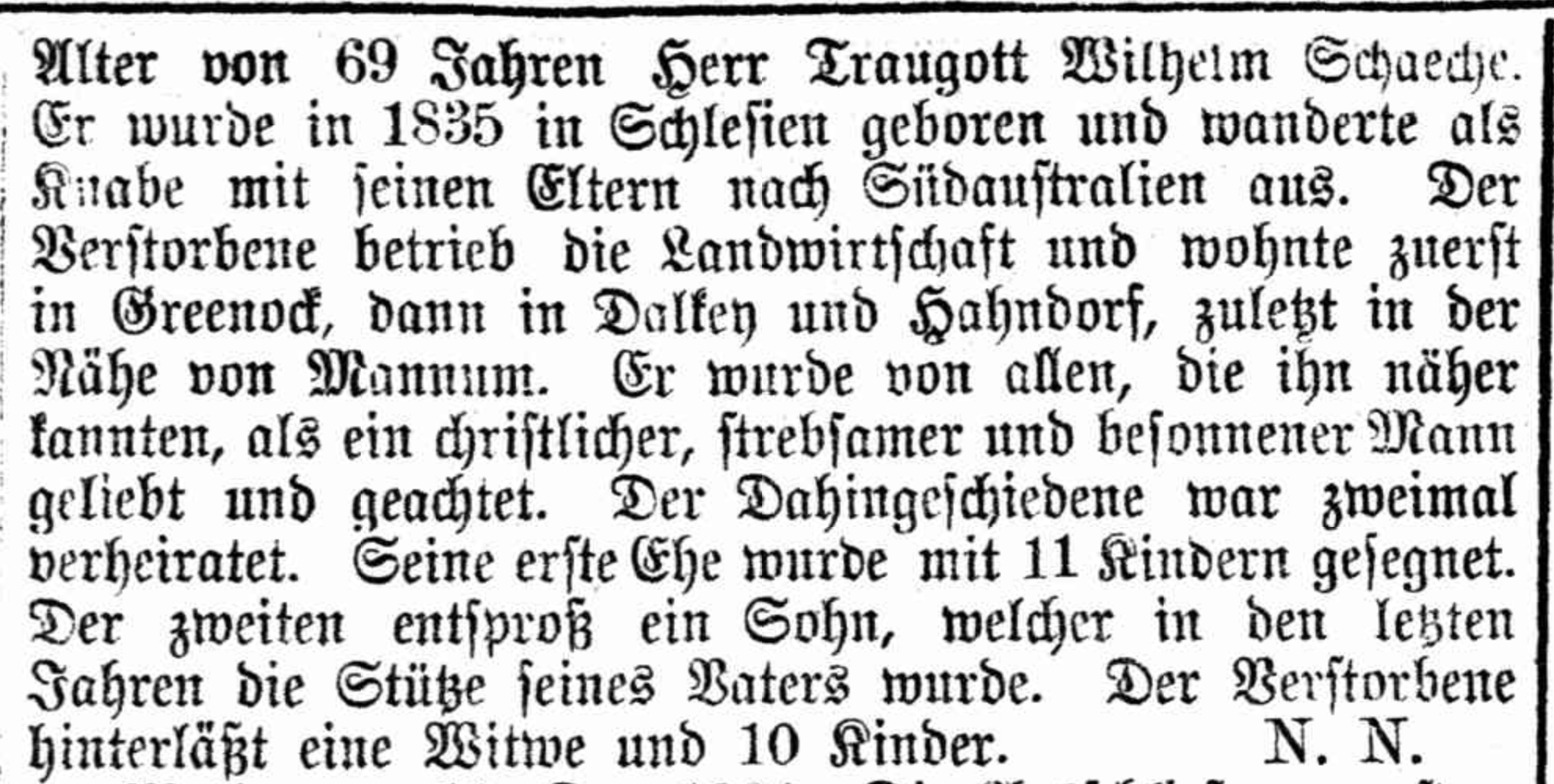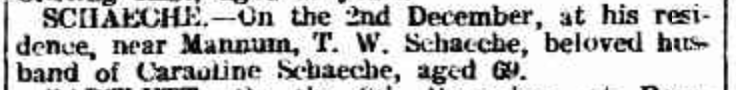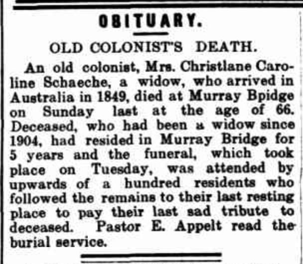 Published References (1.7 SCHACHE) “Producer” (Balaklava, SA), Thursday 5 June 1947, page 5 (part of article) [Trove]. “Express and Telegraph” (Adelaide, SA), Monday 12 December 1904, page 1 (“Deaths”). Also published in “Advertiser” (Adelaide, SA), Tuesday 13 “Australische Zeitung” (Adelaide, SA), Wednesday 14 December 1904, page 5 (extract from article “Einsendungen”) [Trove]. “Australische Zeitung” (Adelaide, SA), Wednesday 14 December 1904, page 5. “Mount Barker Courier and Onkaparinga and Gumeracha Advertiser (SA), Fiday 14 August 1914, page 4.