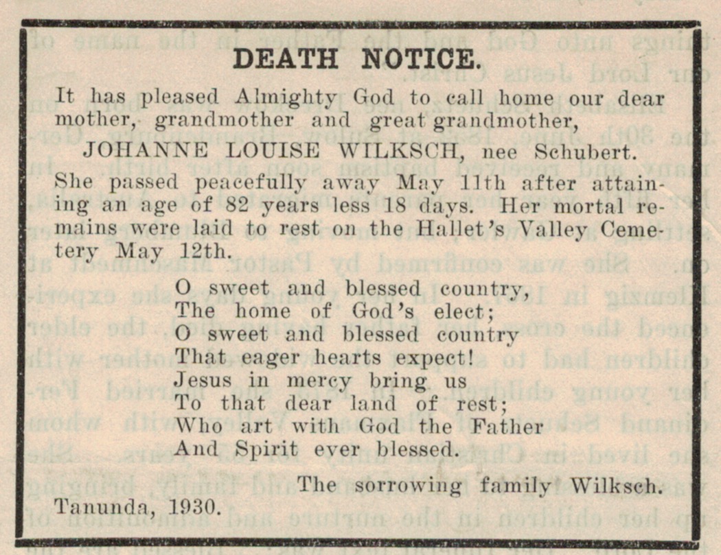 Published References (1.7 SCHUBERT) “South Australian Register” (Adelaide, SA), Thursday 30 December 1897, page 6 [Trove]. “Evening Journal” (Adelaide, SA), Thursday 30 December 1897, page 2 (extract from article “Crums”) [Trove]. “Lutheran Herald” (Tanunda, SA), May 26 1930, page 176.