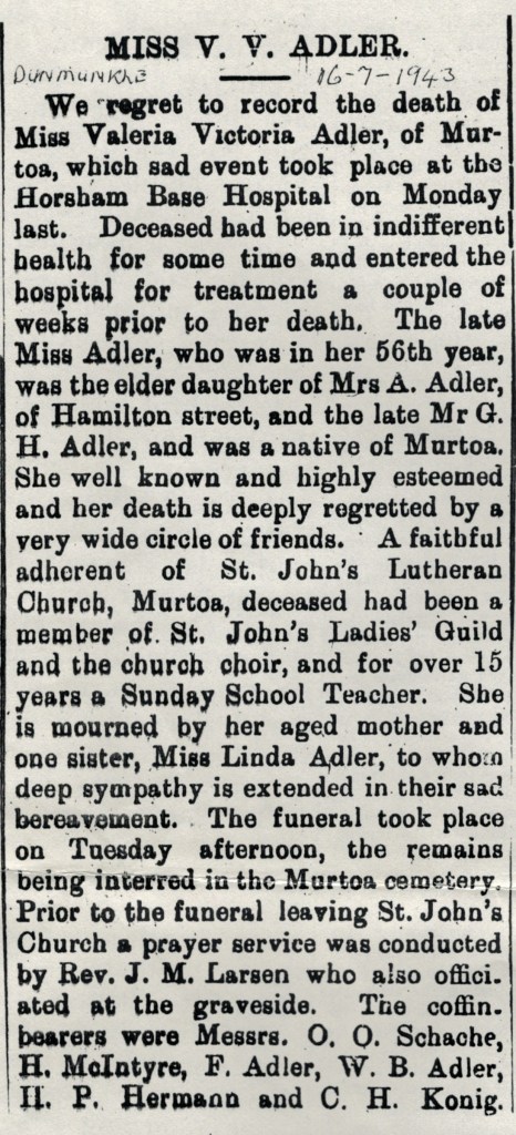 Published References (1.8.1 ADLER) “Dunmunkle Standard and Murtoa Advertiser” (Vic.), Friday 16 July 1943.