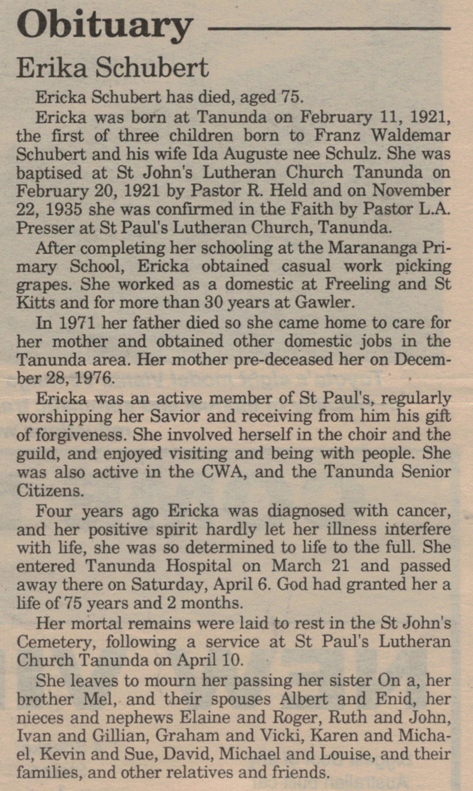 Published References (1.8.11.1 SCHUBERT) Probably “Barossa and Light Herald” (Tanunda, SA), April 1996 [Mellit Schubert].