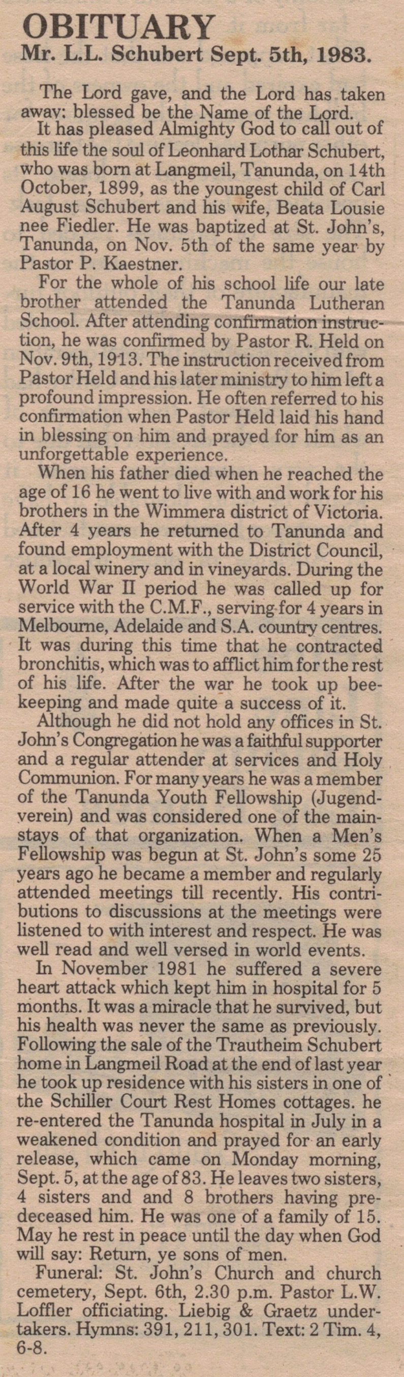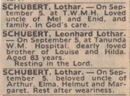 Published References (1.8.15 SCHUBERT) “Barossa and Light Herald” (Tanunda, SA), Thursday 10 September 1970, page 9. This advertisement was published for a number of years. “Barossa and Light Herald” (Tanunda, SA), Thursday 30 March 1973, page 6. “Advertiser” (Adelaide, SA), September 1983. “Barossa and Light Herald” (Tanunda, SA), September 1983.