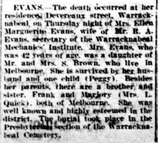 Published References (1.8.2 BOWN) “Horsham Times” (Vic.), Friday 15 October 1943, page 2 (extract from “Obituary”) [Trove].