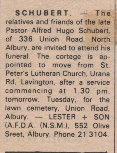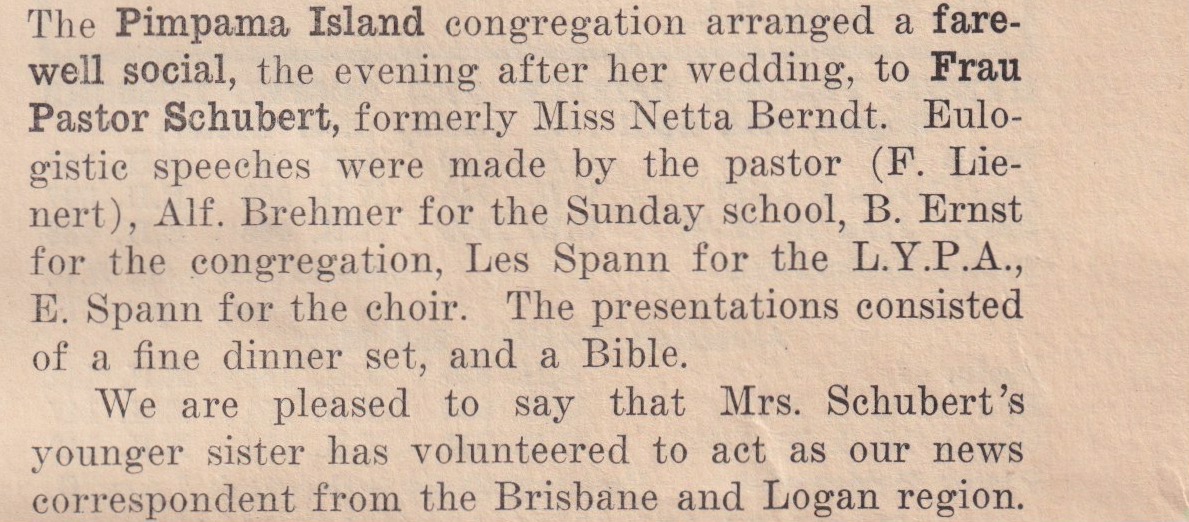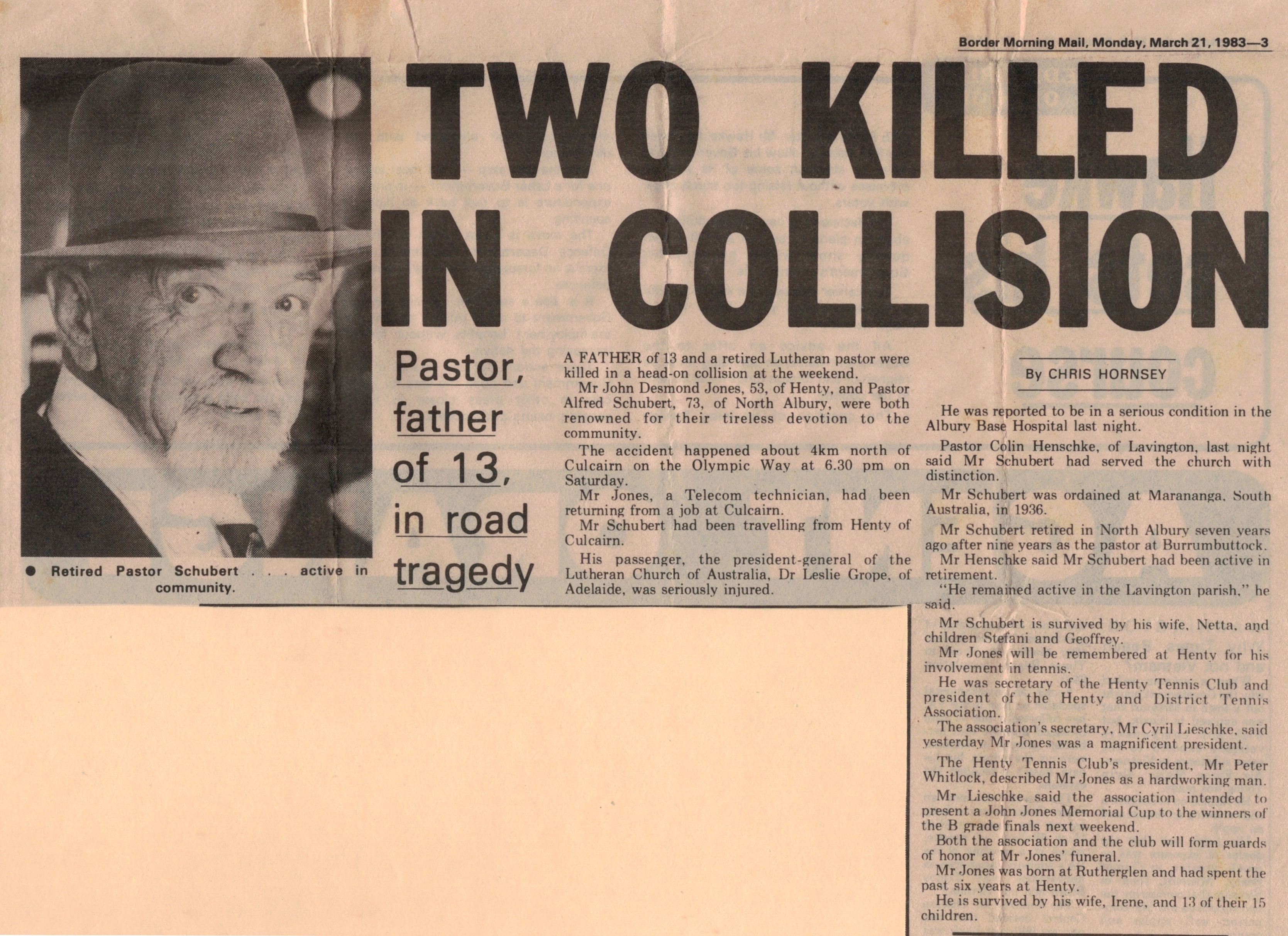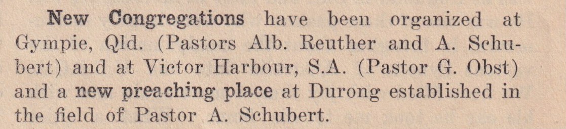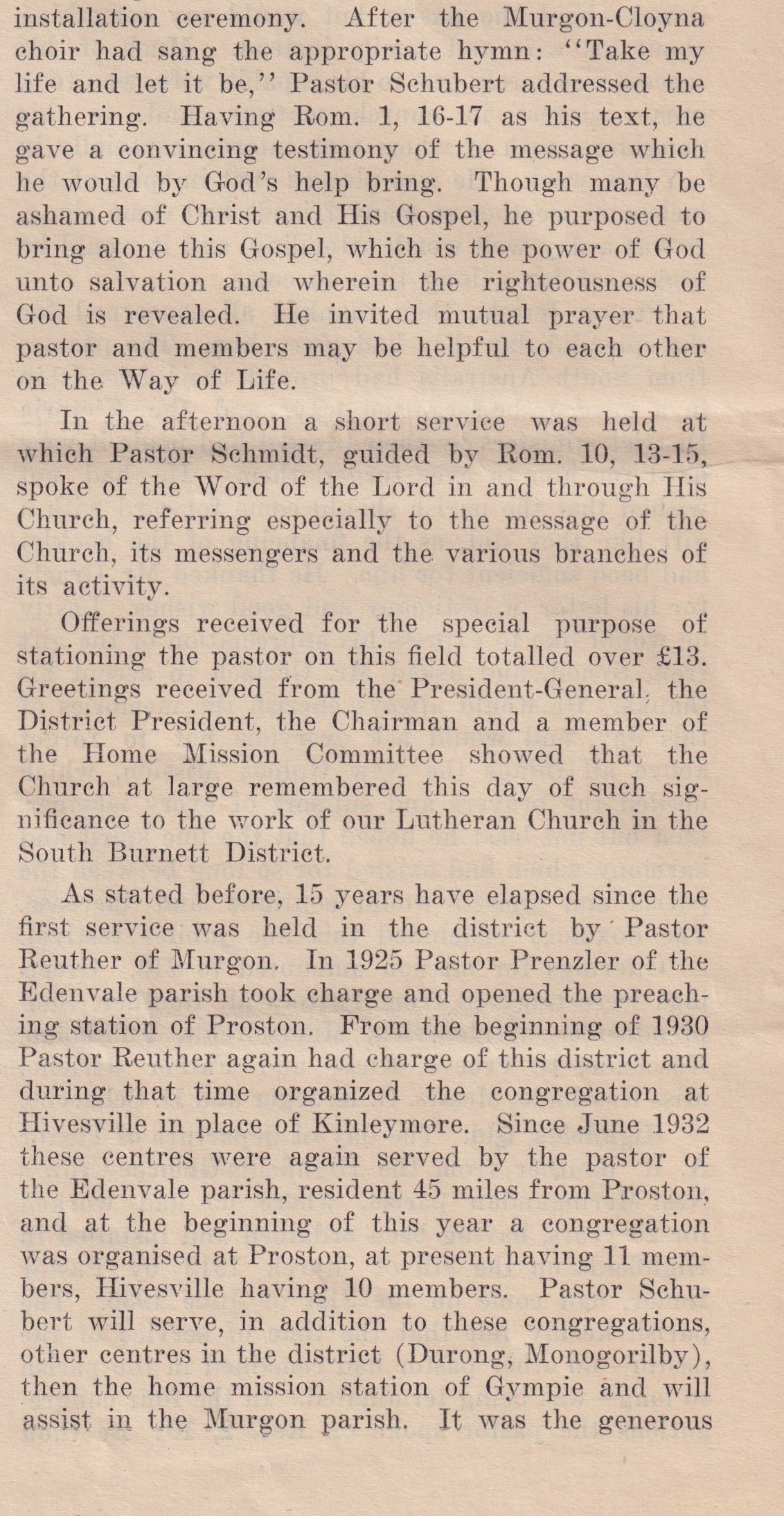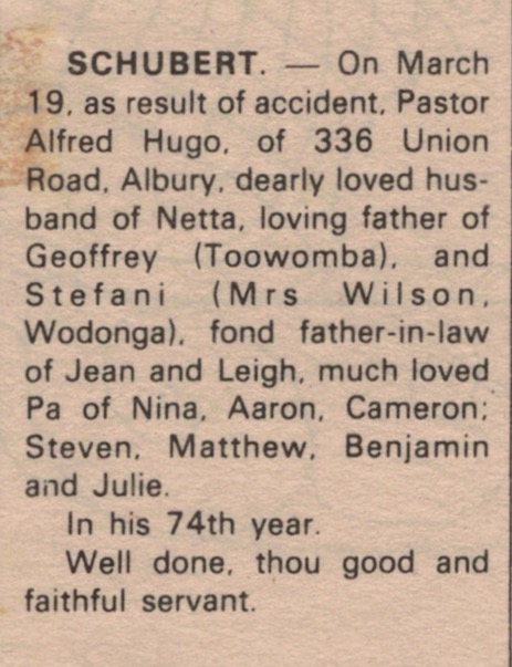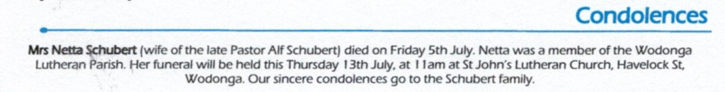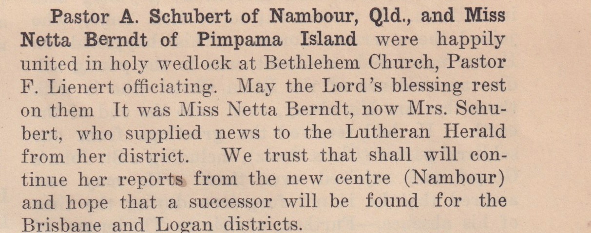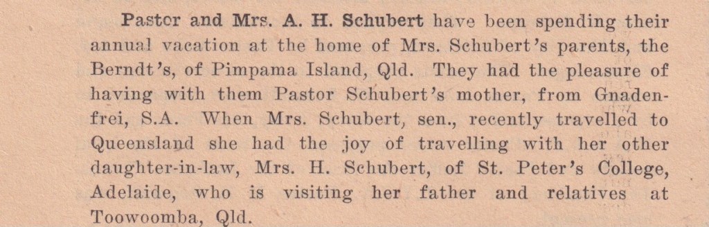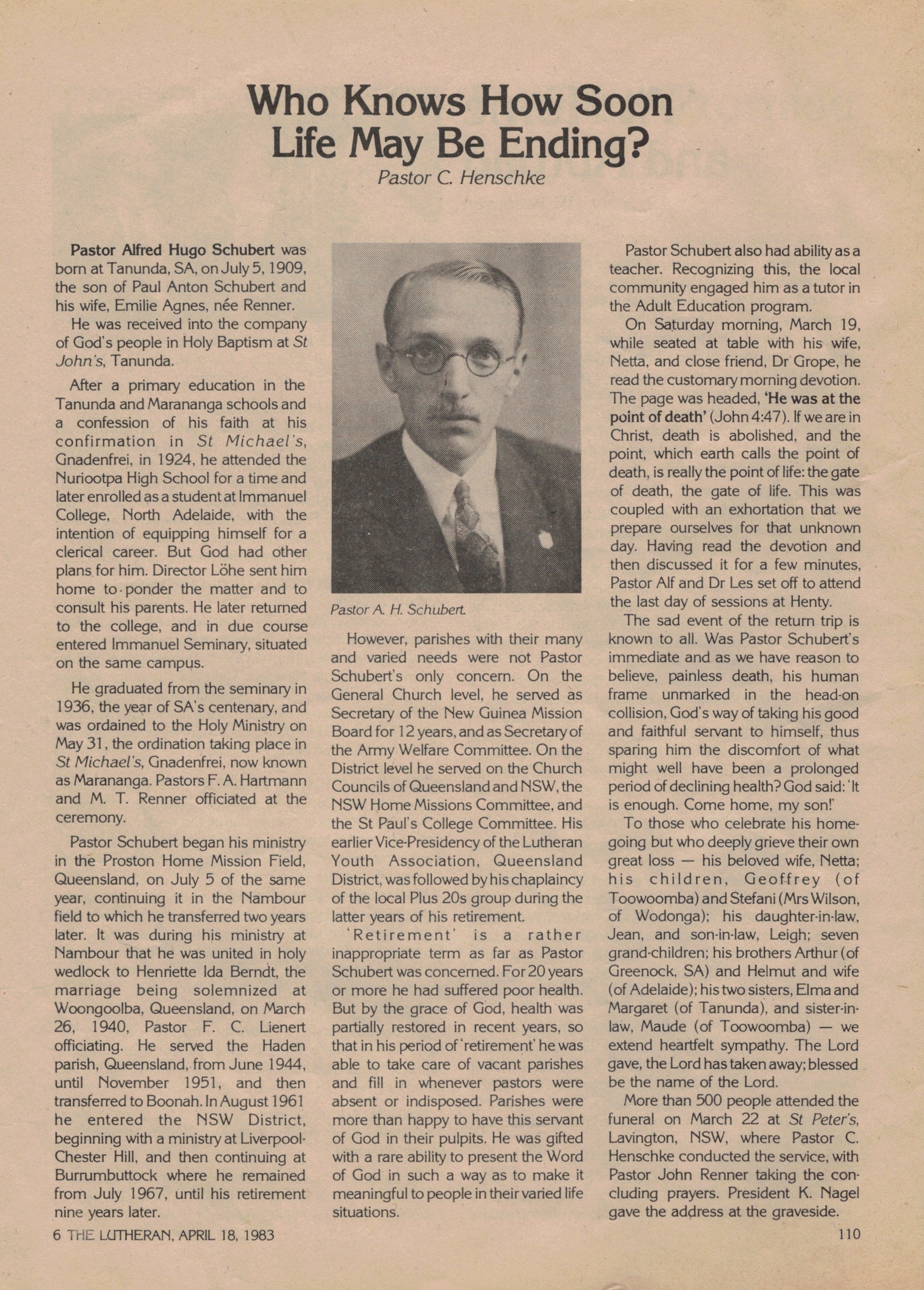Published References (1.8.4.3 SCHUBERT) “Lutheran Herald” (Tanunda, SA), 12 March 1934, (extract from article “Students of Immanuel College and Seminary 1934”), page 90. “Lutheran Herald” (Tanunda, SA), 1 April 1935, (extract from article “Students of Immanuel College and Seminary 1935), page 103. “Lutheran Herald” (Tanunda, SA), 22 June 1936, (extract from article “From our Midst”), page 205. “Lutheran Herald” (Tanunda, SA), 17 August 1936, (extract from article “Installation Festival at Proston, Qld”), pages 268-269. “Lutheran Herald” (Tanunda, SA), 23 November 1936, (extract from article “From our Midst”), page 378. “Lutheran Herald” (Tanunda, SA), 24 October 1938, (extract from article “From our Midst”), page 345. “Lutheran Herald” (Tanunda, SA), 8 April 1940, (extract from article “From our Midst”), page 125. “Lutheran Herald” (Tanunda, SA), 22 April 1940, (extract from article “From our Midst”), page 143. “Lutheran Herald” (Tanunda, SA), 3 June 1940, (extract from article “Queensland Convention of L.Y.P.A.”), page 181. “Lutheran Herald” (Tanunda, SA), 3 February 1941, (extract from article “From our Midst”), page 45. “Lutheran Herald” (Tanunda, SA), 4 August 1941, page 143, (extract from article “From our Midst”), page 143. “Lutheran Herald” (Tanunda, SA), 2 January 1943, (extract from article “Our Queensland Home Missioners tell us about their Fields”), pages 8-9. “Lutheran Herald” (Tanunda, SA), 28 September 1946, (extract from article “From our Midst”), page 315. Probably “Border Morning Mail” (Wodonga, Vic.), Wednesday 5 May 1982 [Elvie Tilley (Schache)]. Probably “Border Morning Mail” (Wodonga, Vic.), Wednesday 9 March 1983 [Elvie Tilley (Schache)] “Border Morning Mail” (Wodonga, Vic.), Monday 21 March 1983, page 3 [Elvie Tilley (Schache)]. Probably “Border Morning Mail” (Wodonga, Vic.), March 1983 (“Deaths”) [Elvie Tilley (Schache)]. “Lutheran” (Adelaide, SA) 18 April 1983, page 6. “Australian Christian” (National Journal of Churches of Christ in Australia), 23 April 1983 (extract from article “Happenings”). “District Notes” (Victoria/Tasmania District, Lutheran Church of Australia), 10 July 2013.